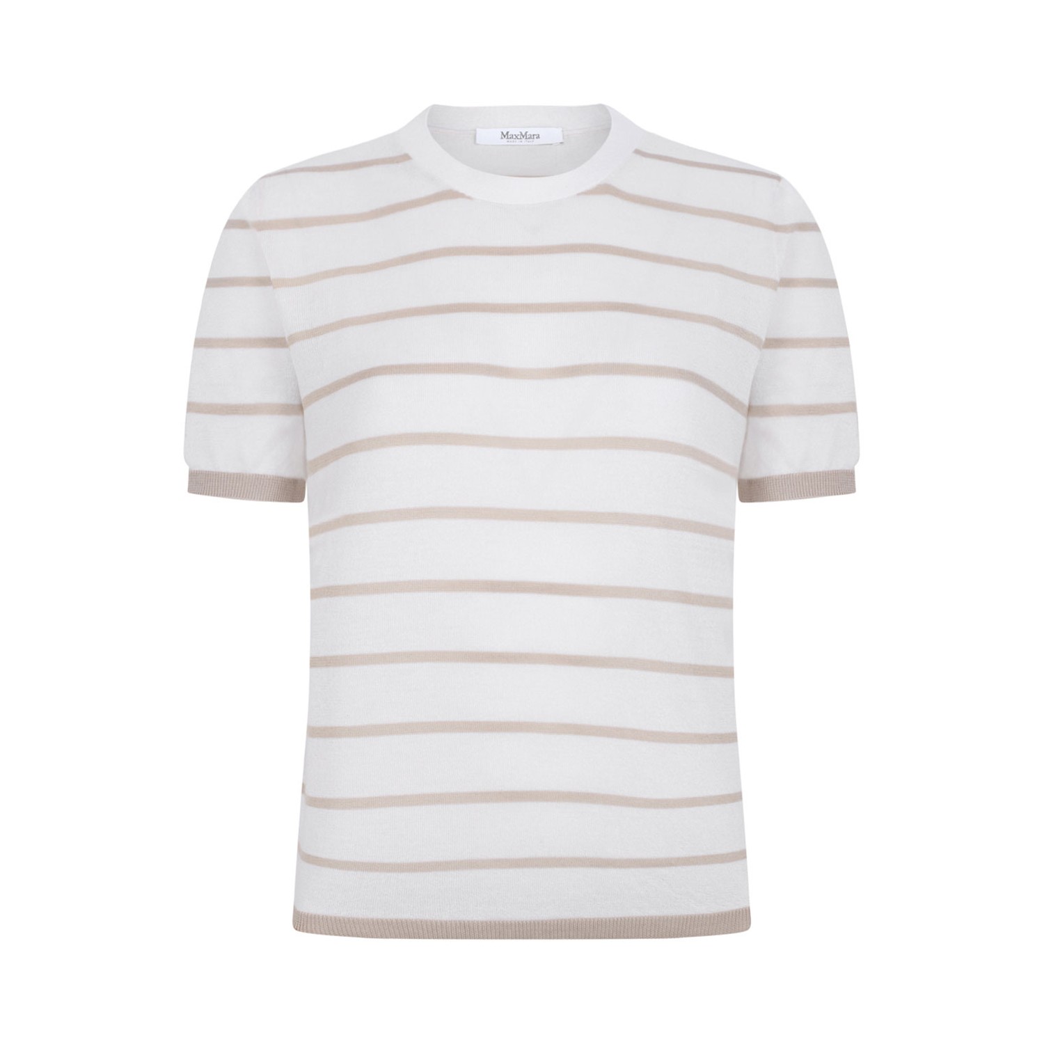 Max Mara White and Beige Striped Cashmere and Silk Yarn Sweater. White and beige striped cashmere and silk yarn sweater with semi-fitted line, choker, short sleeves.