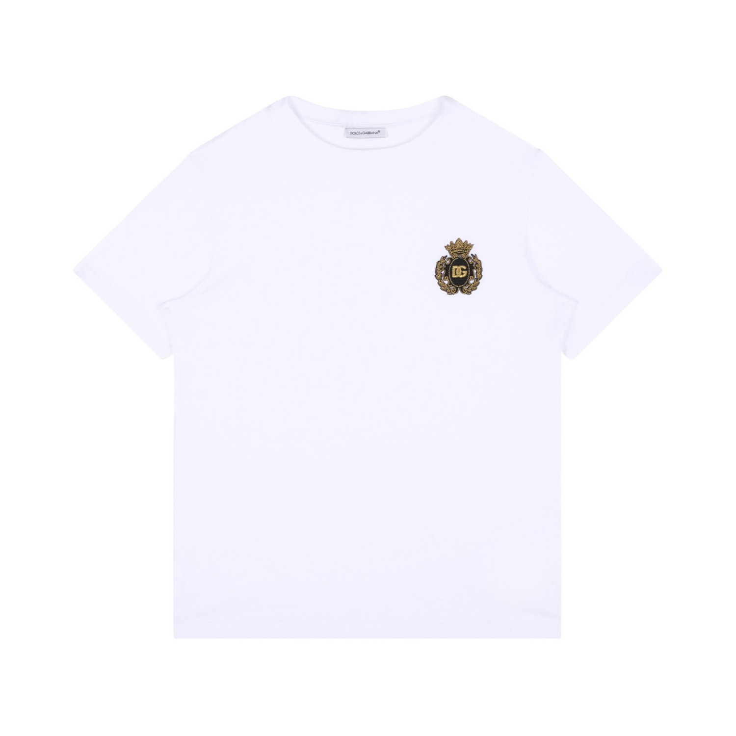 Dolce & Gabbana Kids White Logo Embroidered T-Shirt. White cotton t-shirt with logo embroidered to the front, crew neck, short sleeves and straight hem.