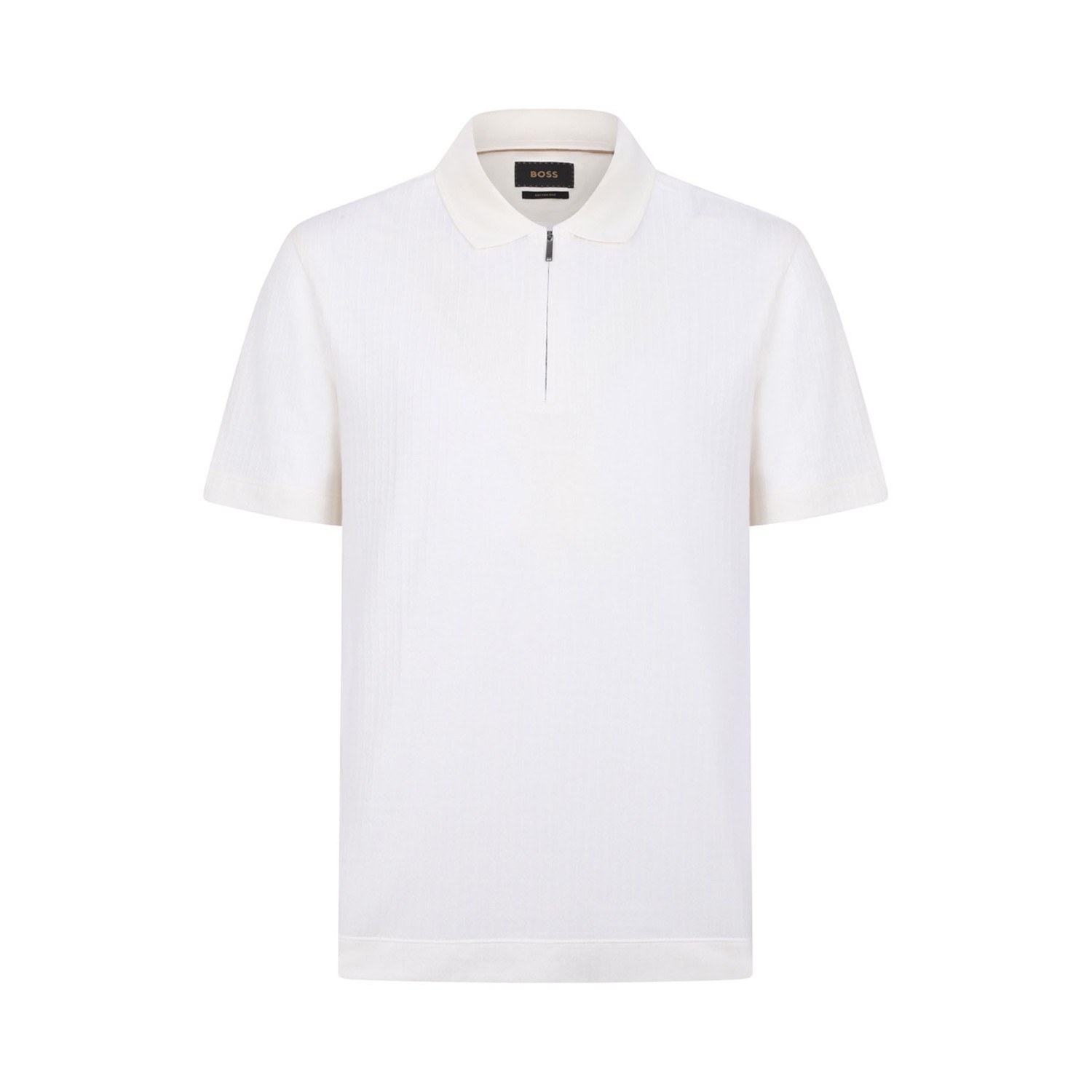 Boss Camel Natural Zip-Neck Polo Shirt In Cotton And Silk. Natural cotton-silk blend polo shirt with zip placket, geometric jacquard. Polo collar, Short sleeves and side slit.
