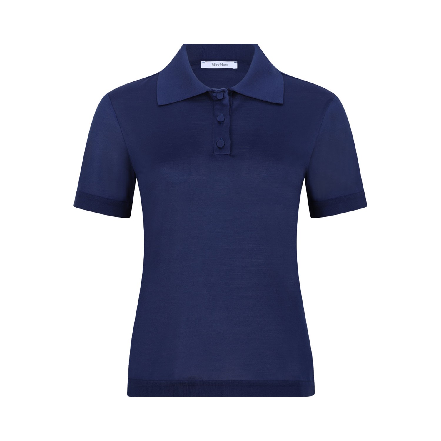 Max Mara Navy Blue Short-Sleeve Polo In Silk. Navy blue short-sleeve polo with a clean, feminine and refined silhouette. Polo crafted in silk with a classic polo collar, three-button placket, fitted cut and ribbed cuffs and hem for an elegant, versatile everyday look.