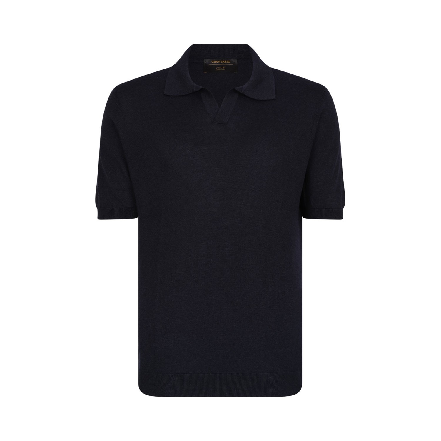 Gran Sasso Navy Blue Short-Sleeve Polo Sweater In Cotton. Navy blue short-sleeve polo sweater with a refined, minimalist silhouette. Sweater crafted in fine cotton knit with a soft, lightweight and breathable texture. Featuring an open polo collar without buttons, ribbed cuffs and hem, and a clean finish for an elegant, versatile look suitable for both casual and smart styling.