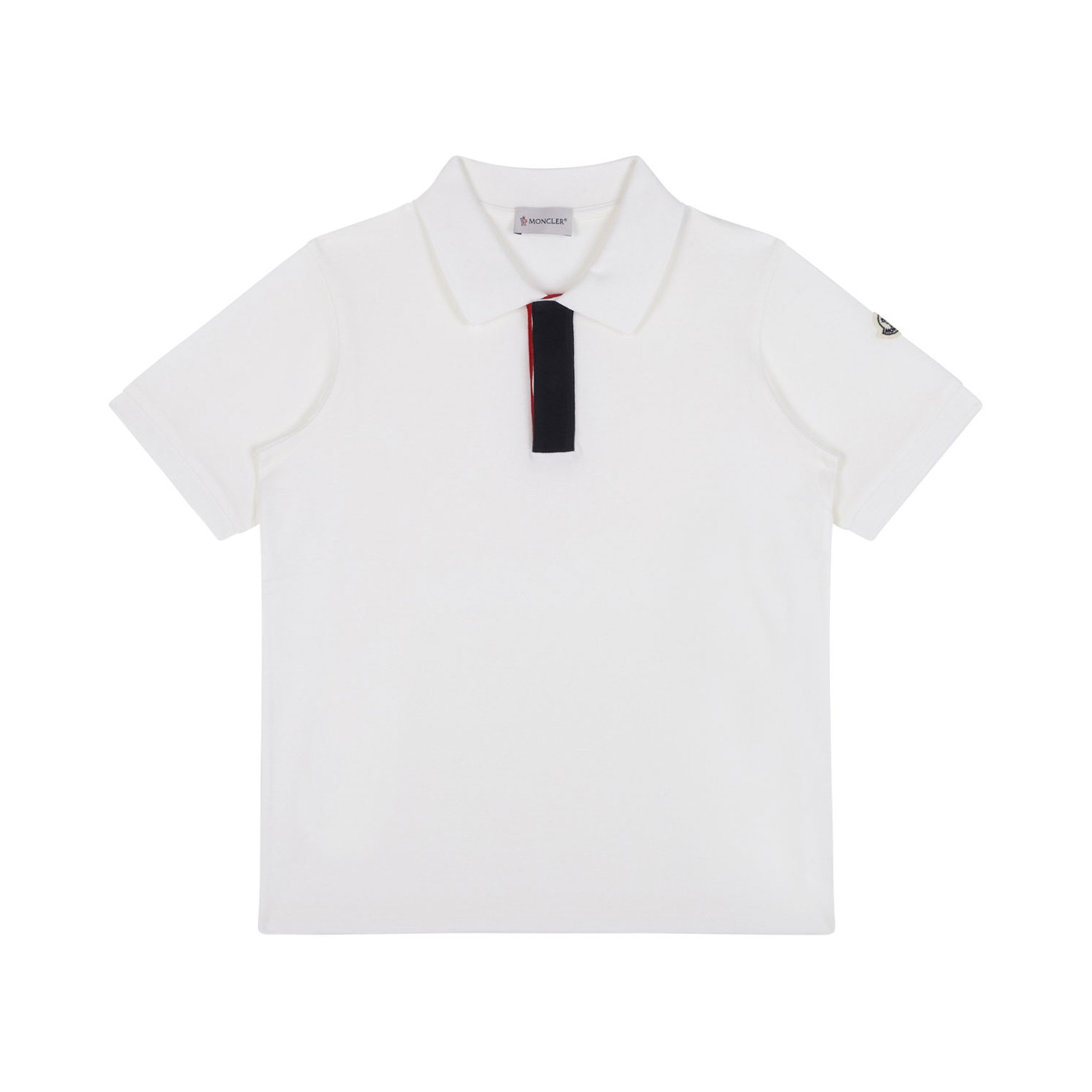 Moncler Kids Ivory Polo Shirt With Logo. Ivory cotton pique polo shirt with short sleeves, a pointed collar, a front button closure, and a blue detail on the front. It features an iconic logo patch on the sleeve.