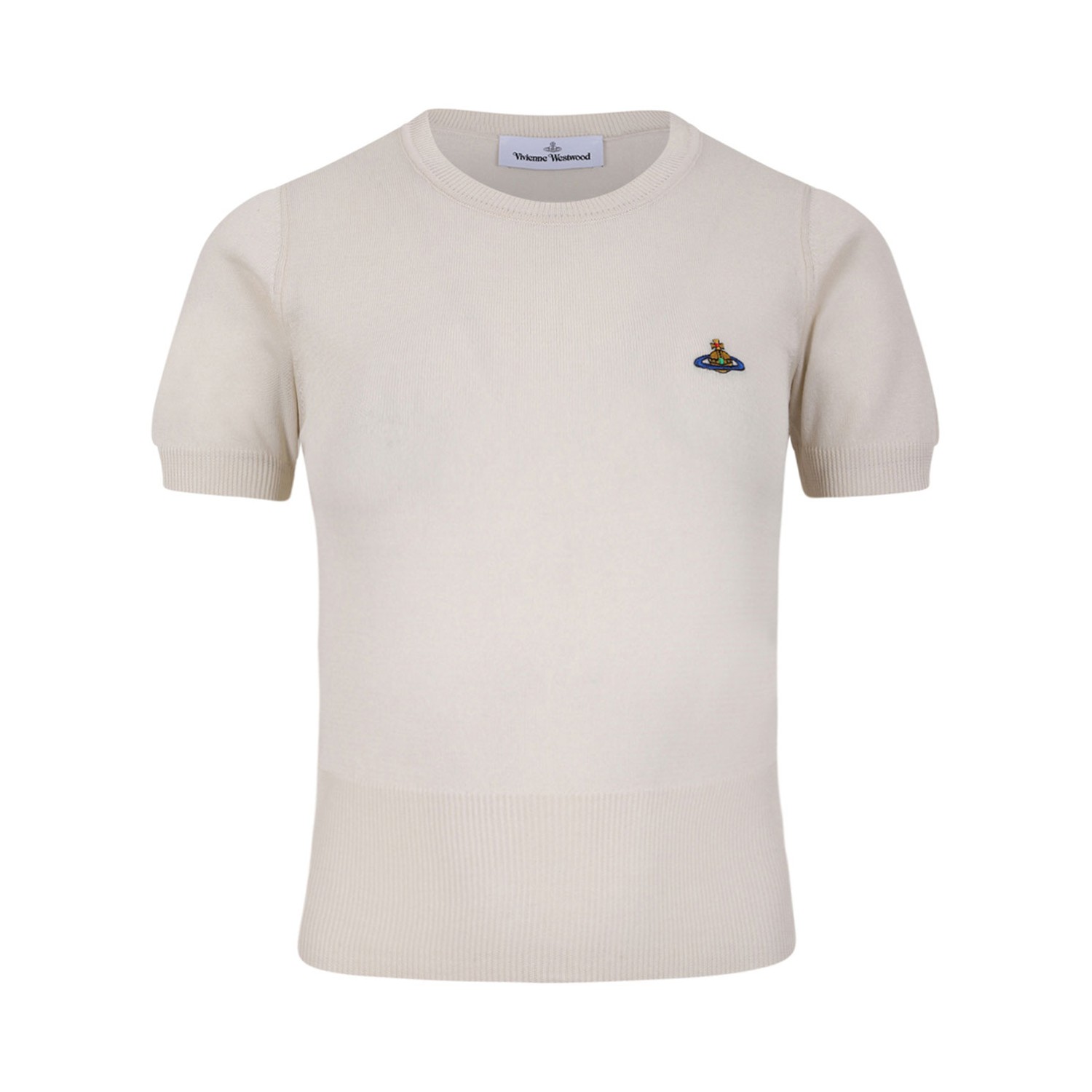 Vivienne Westwood Cream Bea Cotton T-Shirt With Orb Embroidered. Cream short-sleeve T-shirt with a clean, minimalist silhouette. T-shirt crafted in soft pure cotton jersey with a lightweight, comfortable feel. Featuring a classic round neckline, straight fit and the iconic multicolor Orb embroidery on the chest for a distinctive Vivienne Westwood signature touch.