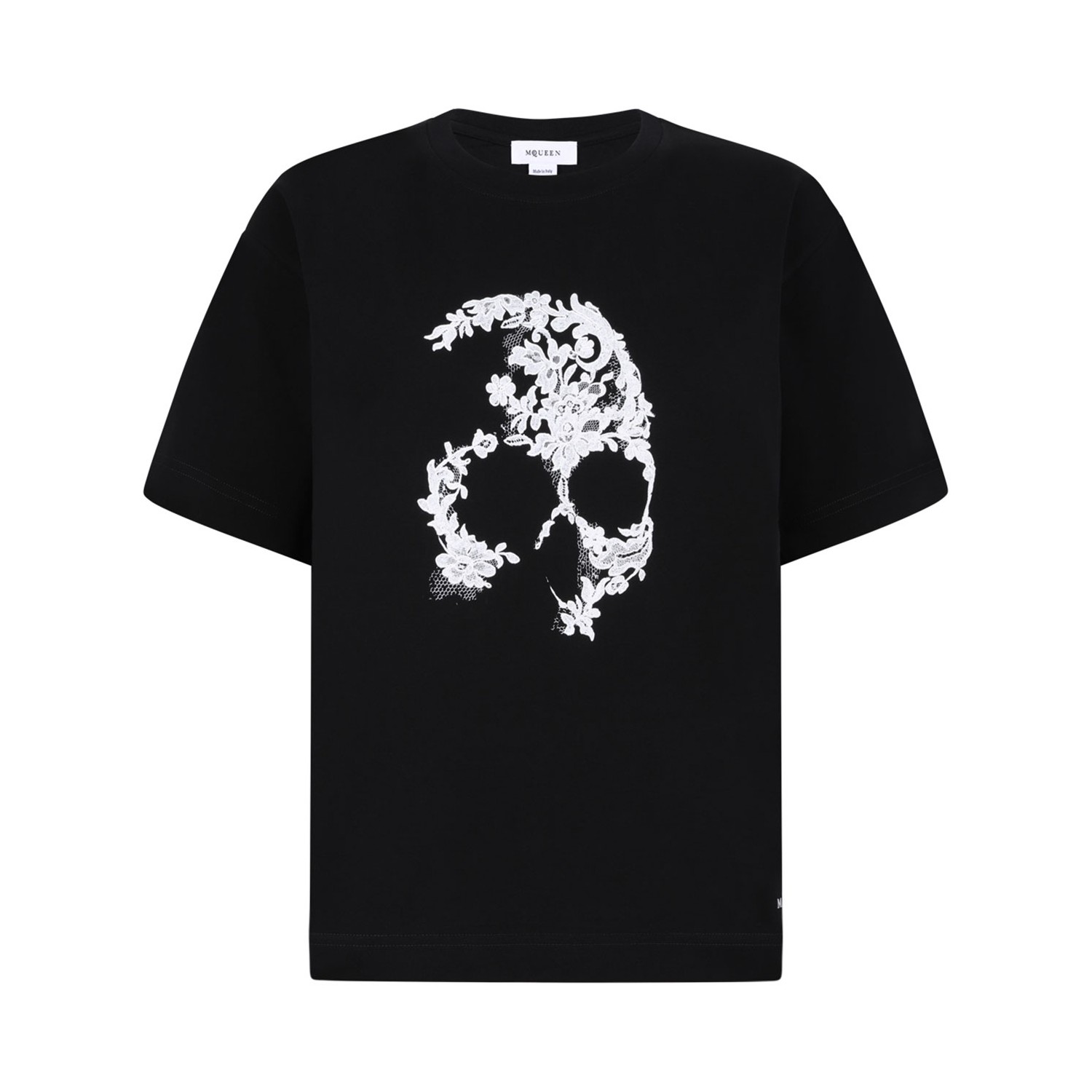 Alexander McQueen Black Cotton Lace Skull T-Shirt. Crew neck T-shirt in white cotton jersey. White Lace Skull digital print on the front and McQueen logo at the hem. Short sleeves.