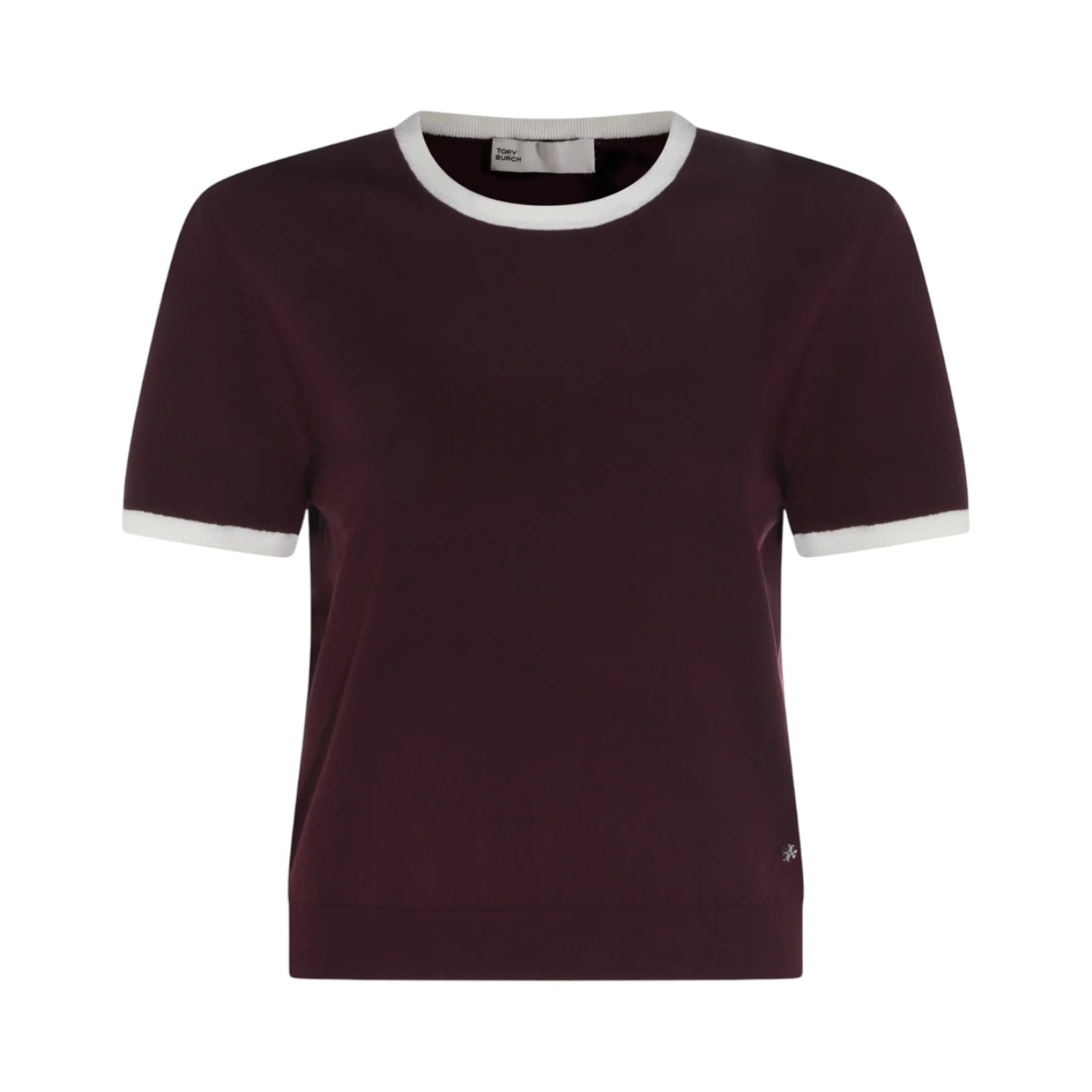 Tory Burch Dark Merlot T-Shirt. Short-sleeve T-shirt crafted in soft knit fabric in a rich dark merlot shade. Designed with a classic crew neckline and contrasting white trim on the collar and sleeve cuffs for a refined, sporty touch. Featuring a clean, streamlined silhouette and subtle logo detail at the hem. A versatile wardrobe essential that combines everyday comfort with understated elegance.