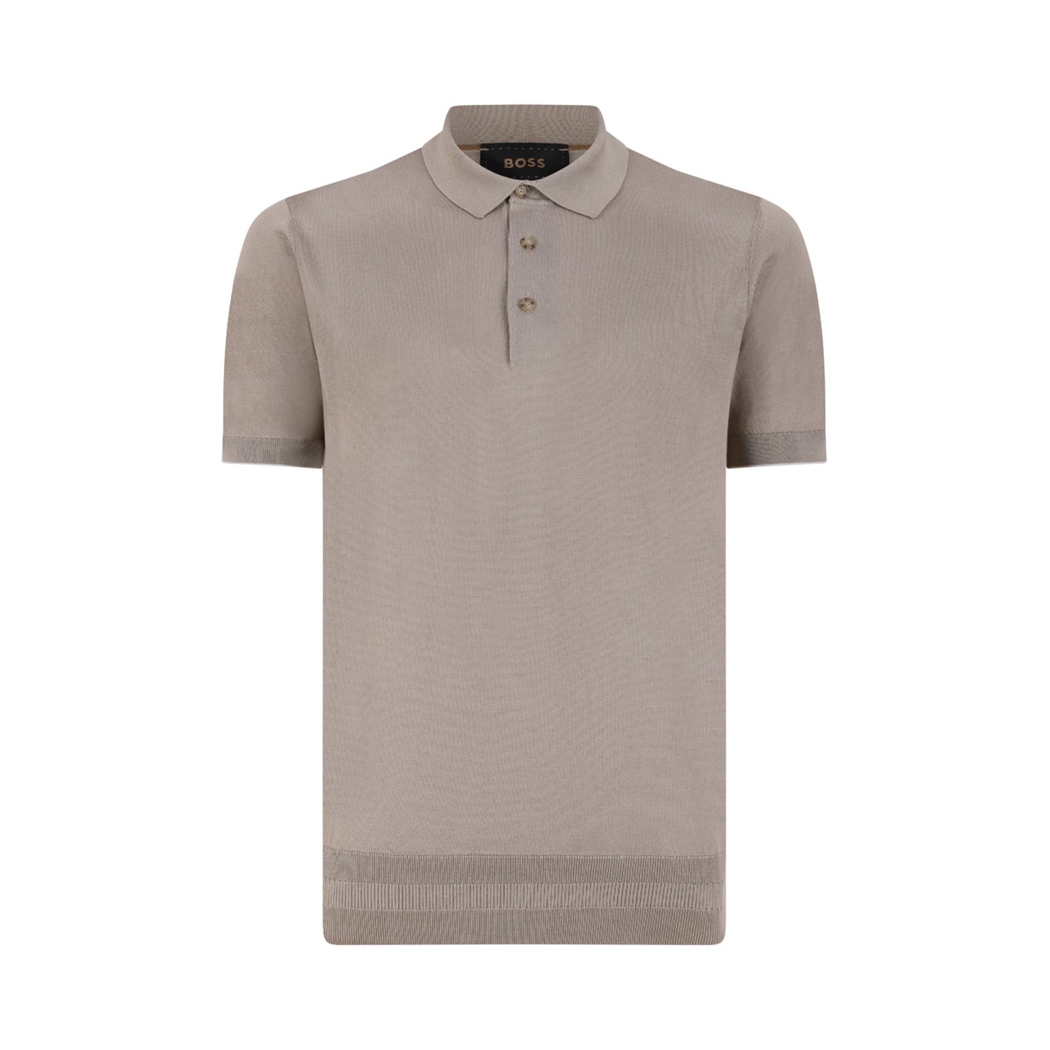 Boss Camel Dark Beige Polo Shirt. Refined short-sleeve polo crafted from a soft cotton blend, designed with a classic collar and three-button placket with tonal buttons. Finished with ribbed trims at the sleeves and hem for added structure and comfort. The clean silhouette and elegant neutral tone make it a versatile essential, perfect for elevated everyday styling.