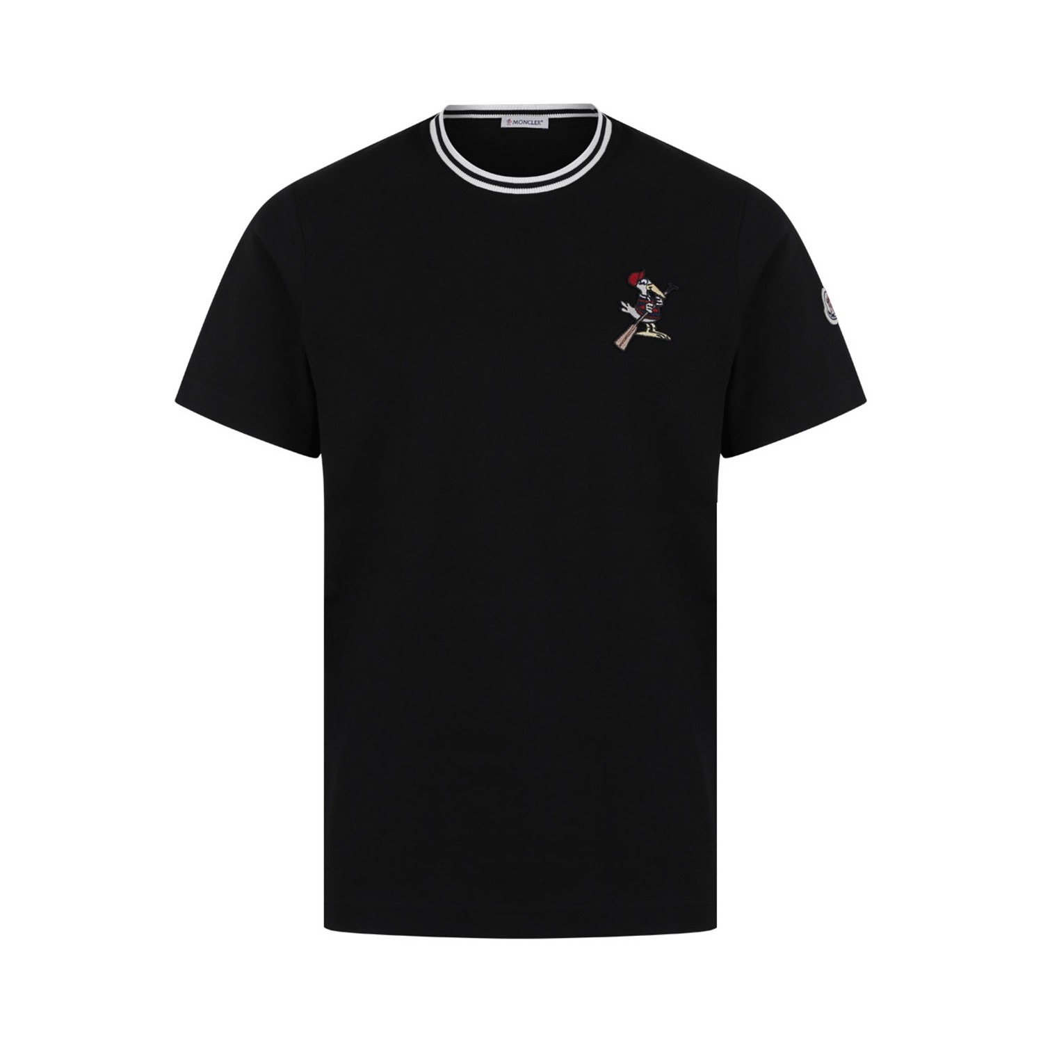 Moncler Black Graphic Cotton T-Shirt. Black short-sleeve T-shirt crafted in soft pure cotton, defined by a sporty silhouette and distinctive detailing. This Moncler tee features a classic crew neckline with contrast double stripe trim for a refined athletic touch. The chest is embellished with a playful skier-inspired graphic, adding character and seasonal appeal. The iconic Moncler felt logo patch on the sleeve completes the design with unmistakable identity. Comfortable and versatile, it is perfect for elevated casual styling and contemporary everyday wear.