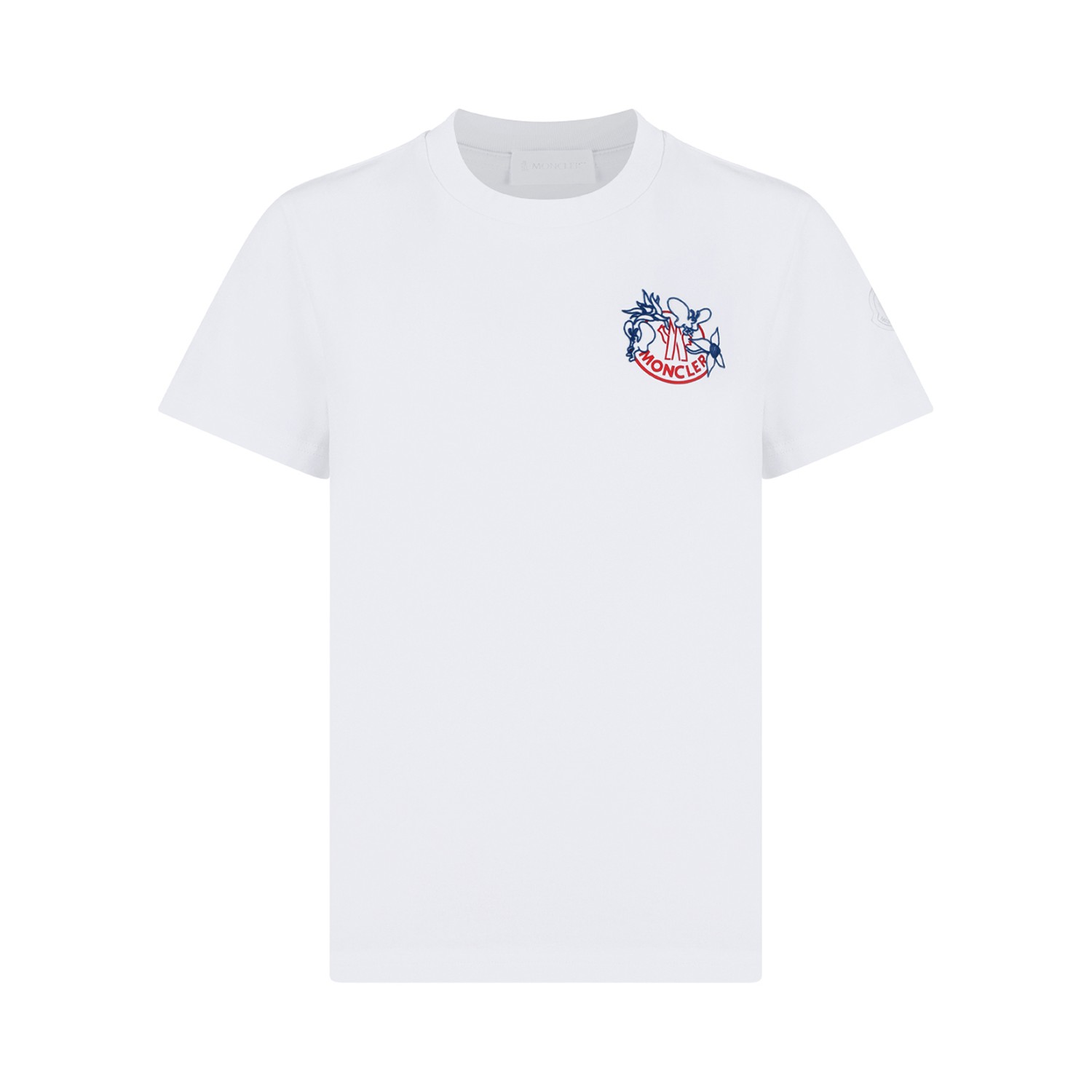Moncler Logo Print Cotton T-Shirt. Short-sleeve T-shirt crafted in soft pure cotton, defined by a clean silhouette and bold signature detailing. This Moncler tee features a classic crew neckline and a regular fit for everyday comfort. The chest is embellished with a multicolour Moncler logo patch inspired by the brand