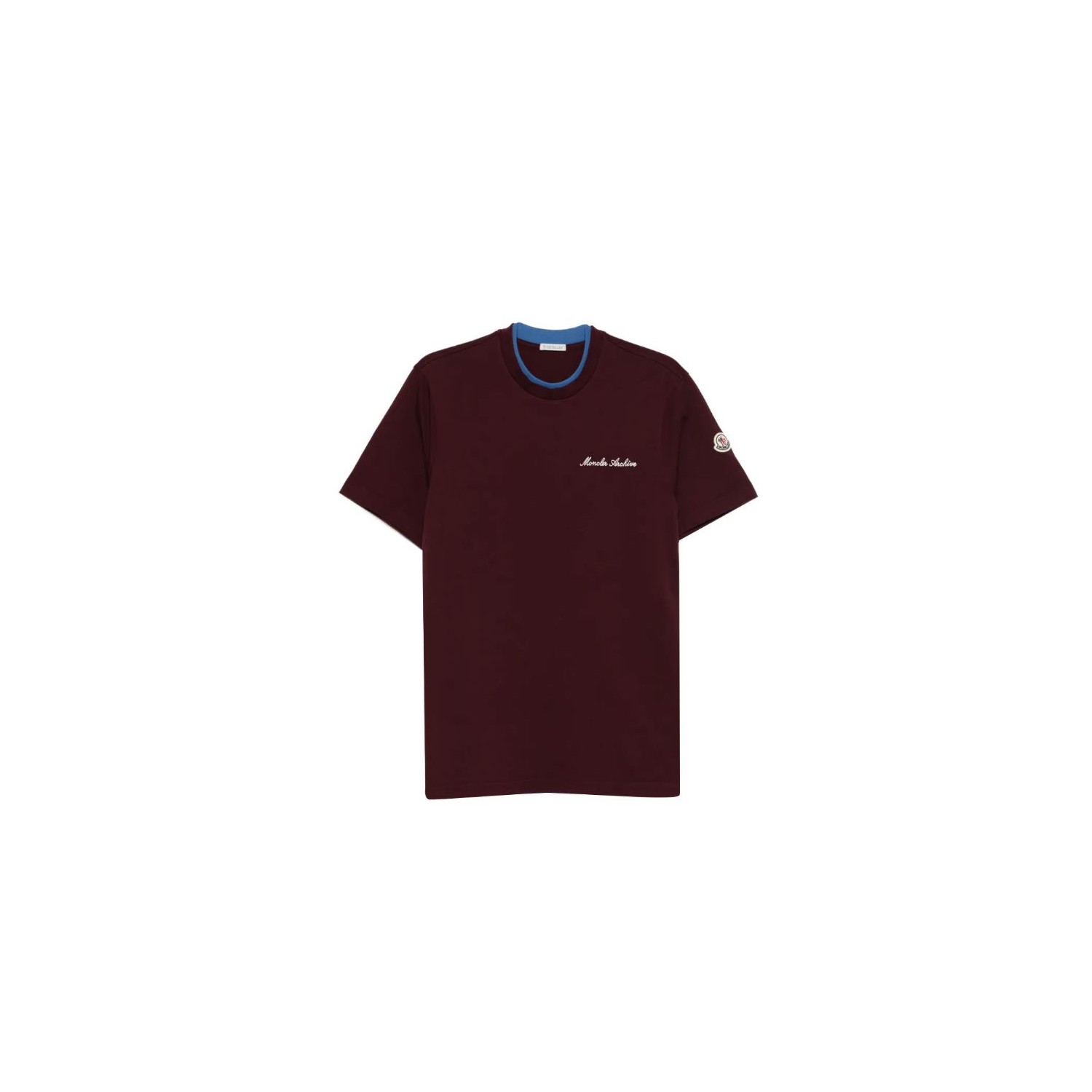 Moncler Burgundy Logo Cotton T-Shirt. Contemporary burgundy T-shirt defined by a refined casual silhouette. Crafted from soft, breathable cotton jersey, this Moncler T-shirt features a classic crew neckline accented with contrasting trim that adds a subtle sporty touch. The regular fit ensures everyday comfort, while the minimalist design is elevated by the delicate Moncler script logo at the chest and the iconic Moncler patch on the sleeve. Clean lines and precise construction reflect the brand