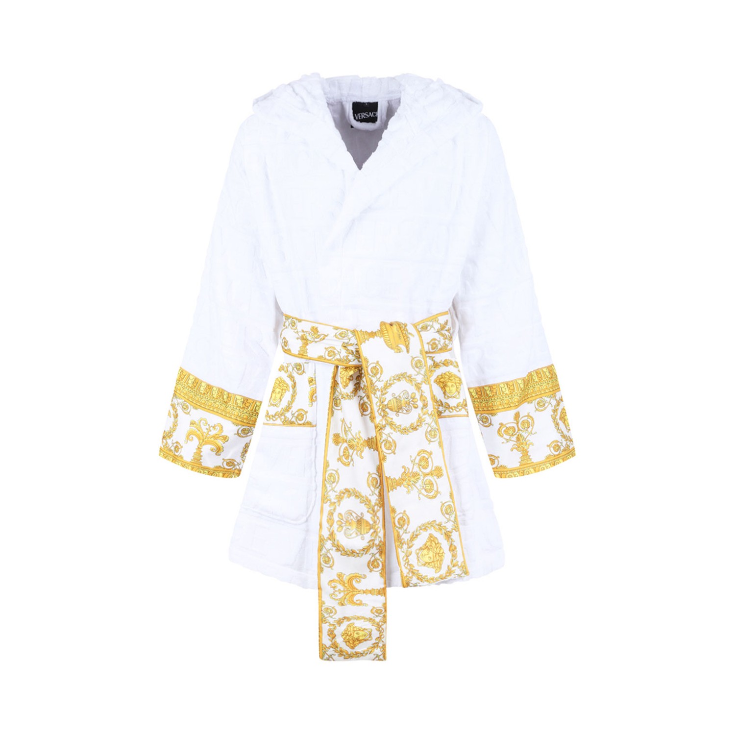 Versace Home White Short Bathrobe I heart Baroque. I heart Baroque short bathrobe in cotton terry with the iconic tone-on-tone jacquard pattern. The bathrobe features printed cotton edges with a heritage design, repeated on the sleeves, pockets and belt.