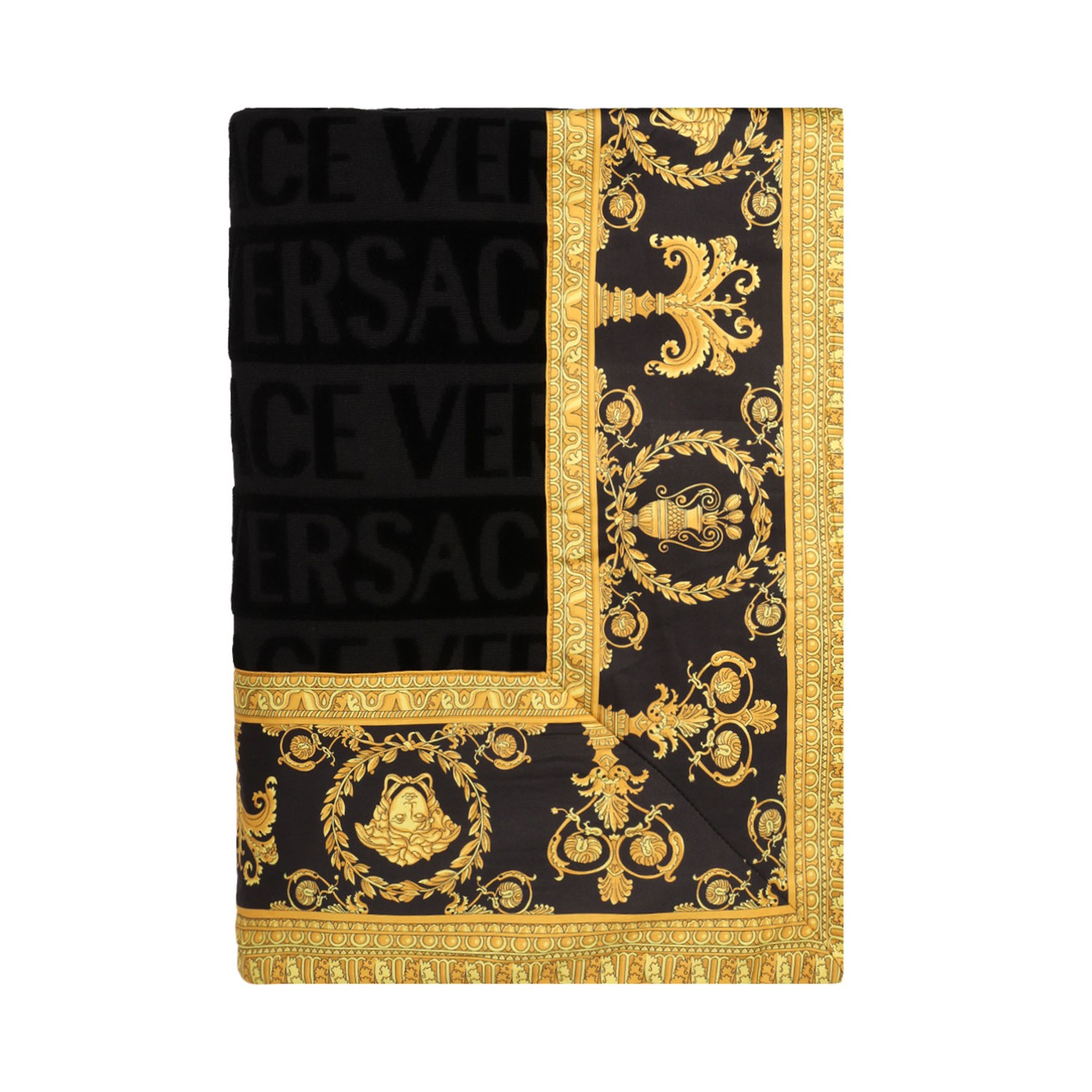 Versace Home Black Beach Towel I Heart Baroque. Black luxurious beach towel in soft cotton terry with tone-on-tone Versace Allover motif and contrasting edges with I Heart Baroque print.