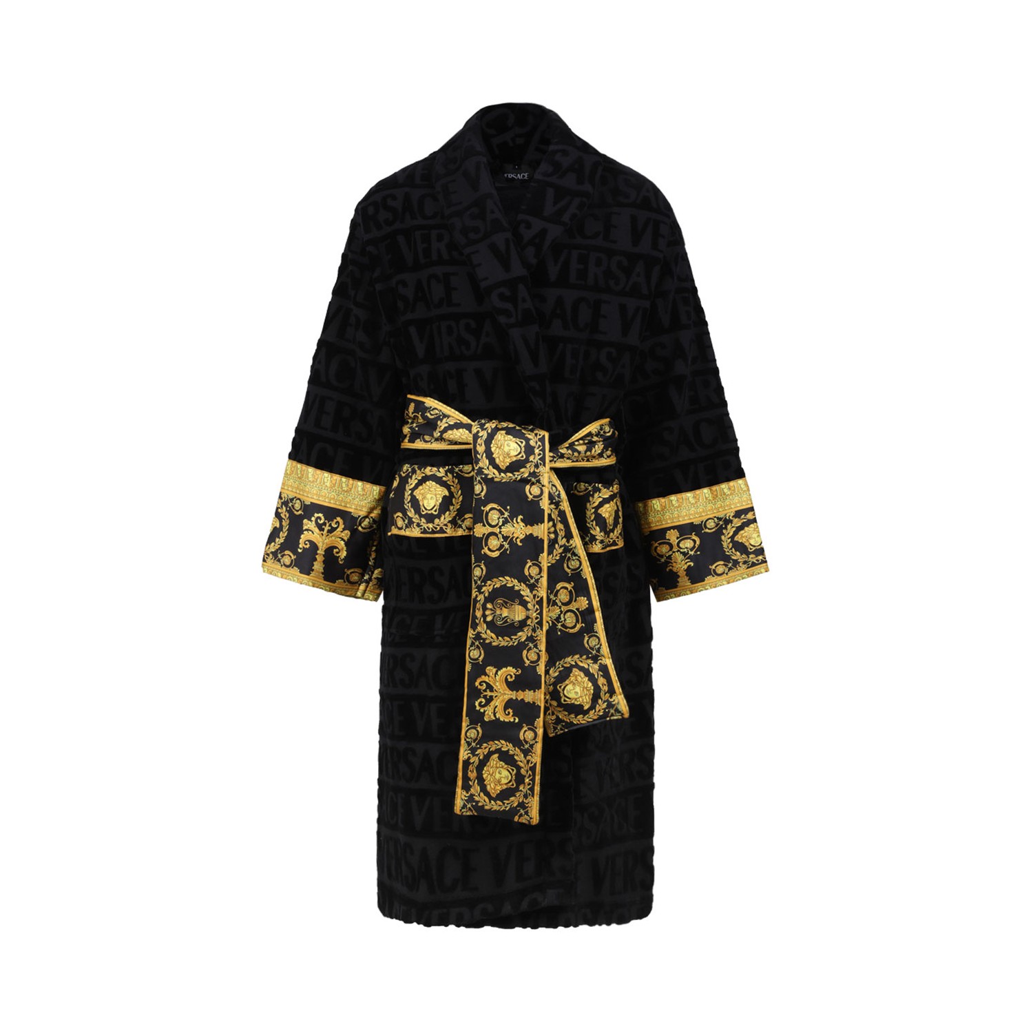 Versace Black I Love Baroque Bathrobe. Black soft terry bathrobe with tone-on-tone Versace Allover logo print, belt and sleeve with Barocco print.