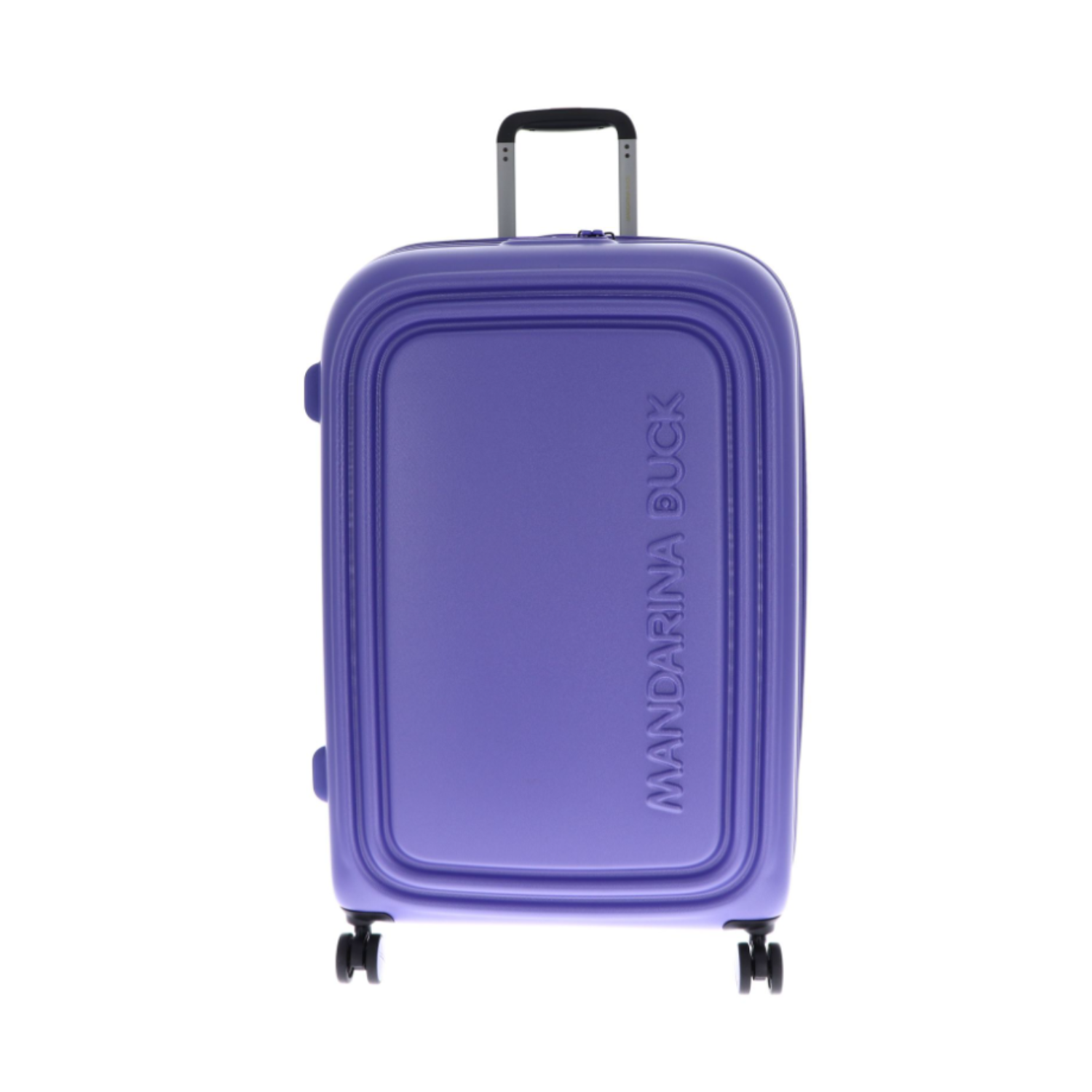 Mandarina Duck Violet Logoduck Trolley Suitcase. Violet trolley suitcase closes with two-way zip front closure (lockable closure), side handle and top handle. TSA combination lock, collapsible luggage tags, expandable size.