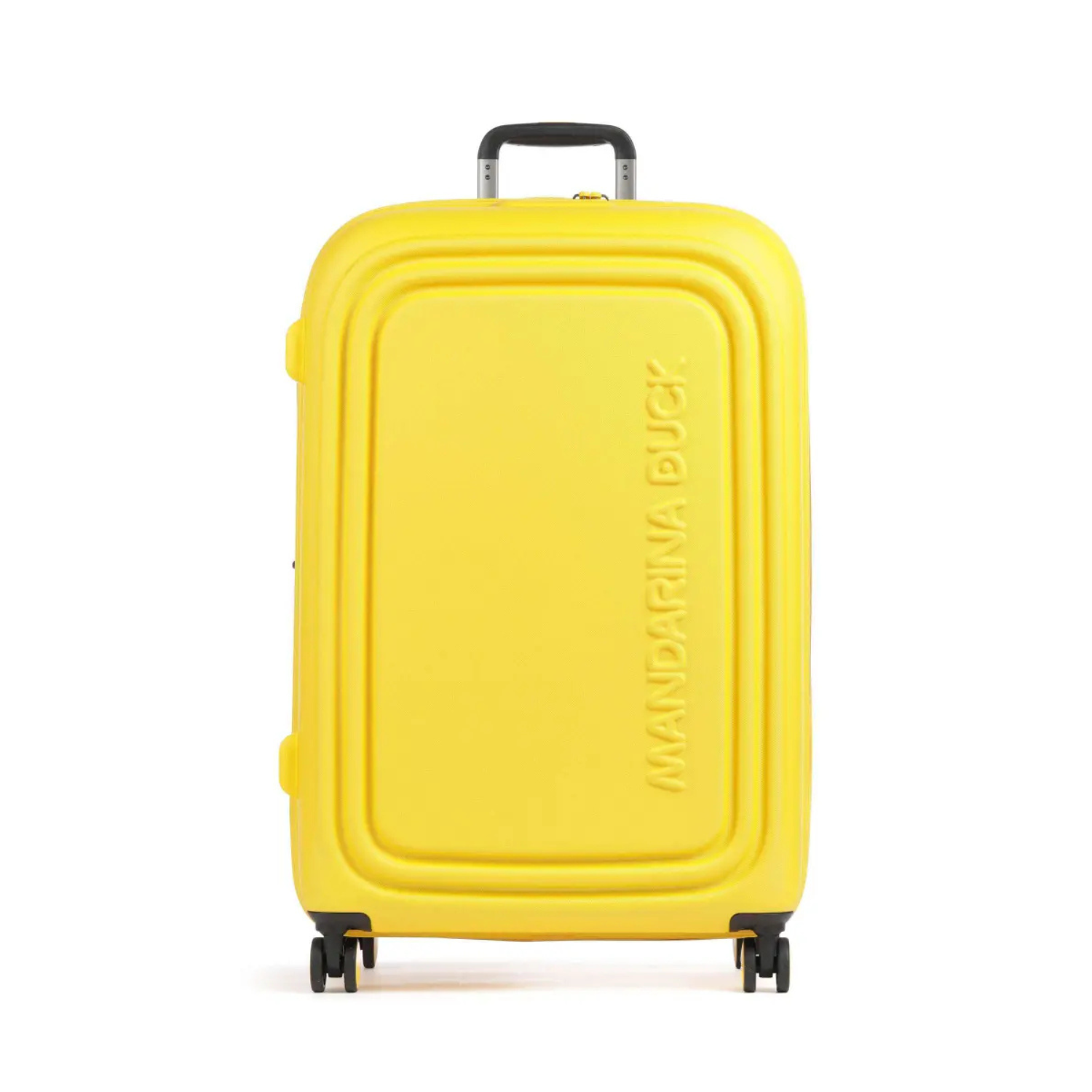 Mandarina Duck Yellow Logoduck Trolley Suitcase. Yellow trolley suitcase closes with two-way zip front closure (lockable closure), side handle and top handle. TSA combination lock, collapsible luggage tags, expandable size.