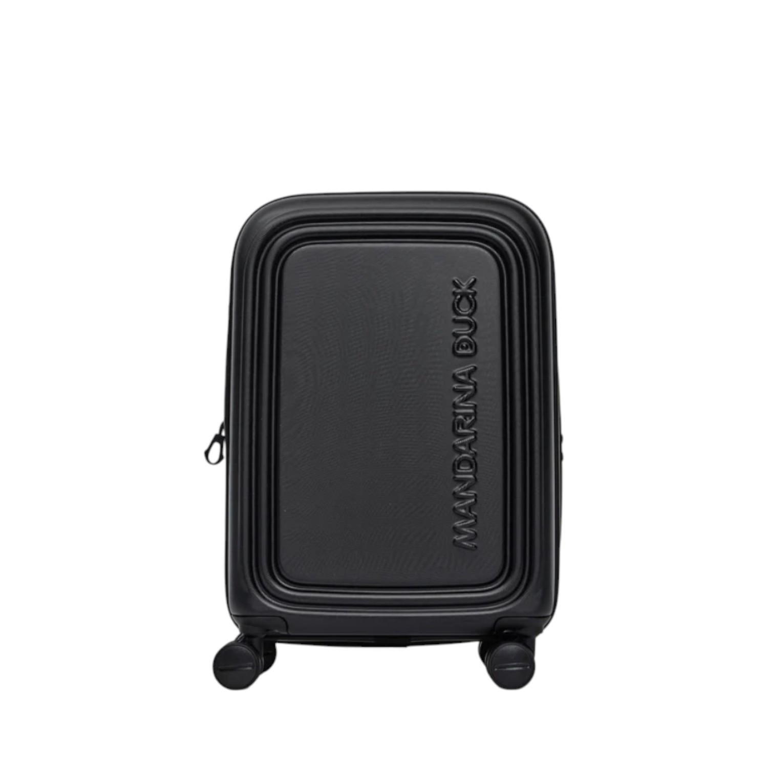 Mandarina Duck Black Trolley Suitcase. Black trolley suitcase closes with two-way zip front closure (lockable closure), one handle, two telescopic. Retractable handles, TSA combination lock and expandable size.