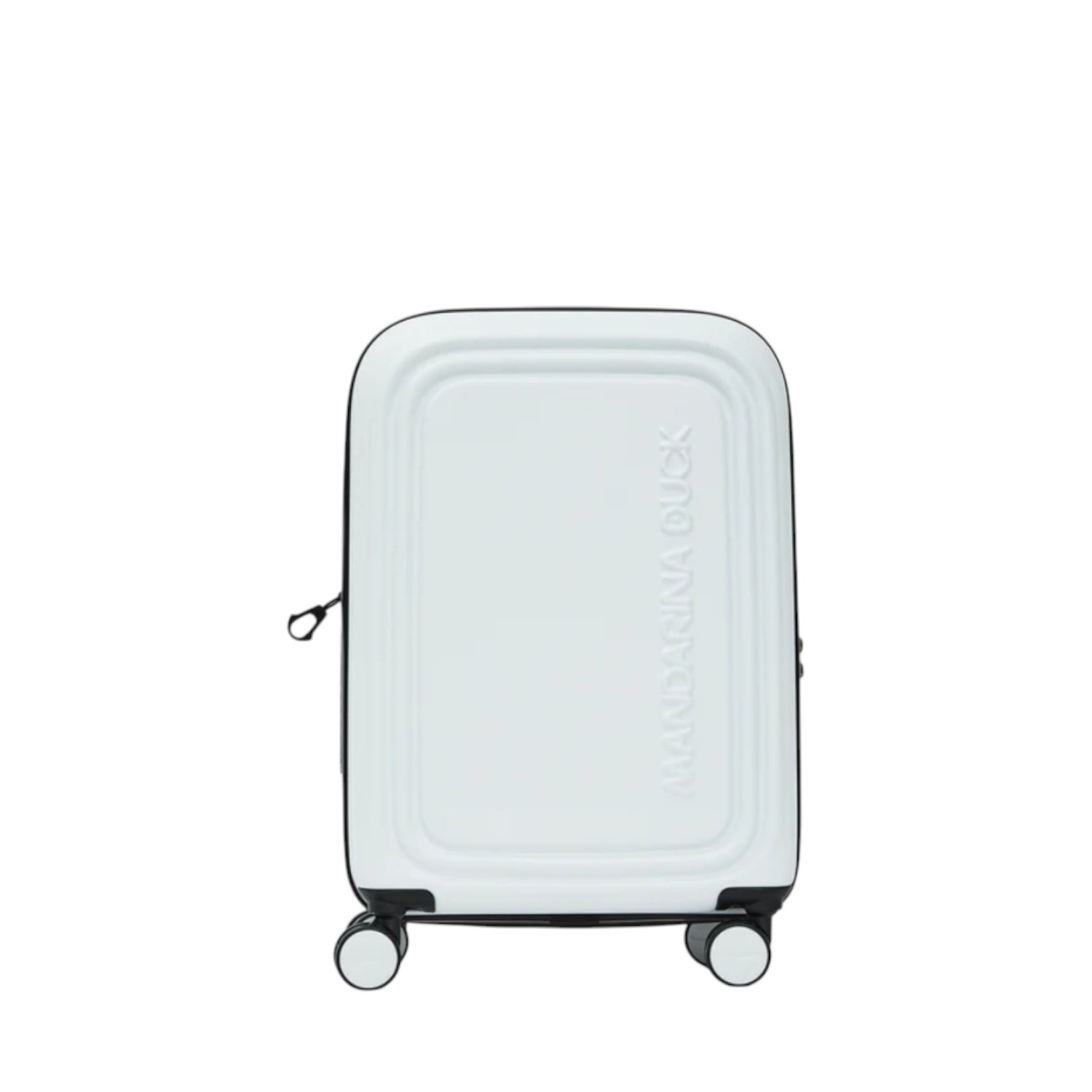 Mandarina Duck White Logoduck Expandable Cabin Trolley. White trolley with two rods, removable and multi-step. Top handle, double compartment, 1 zip pocket. Adjustable straps with buckle and dividing net.