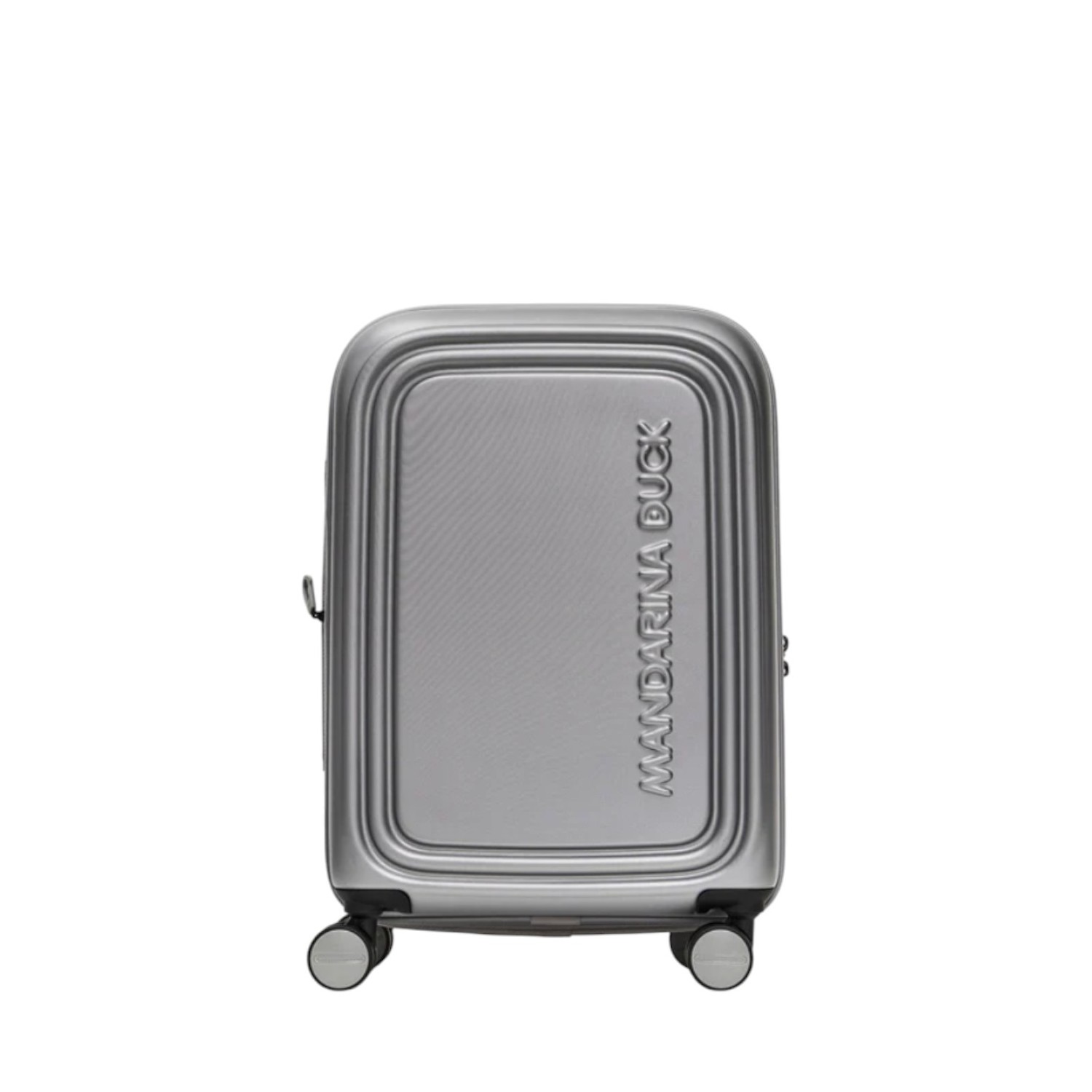 Mandarina Duck Silver Trolley Suitcase. Silver trolley suitcase closes with two-way zip front closure (lockable closure), one handle, two telescopic. Retractable handles, TSA combination lock and expandable size.