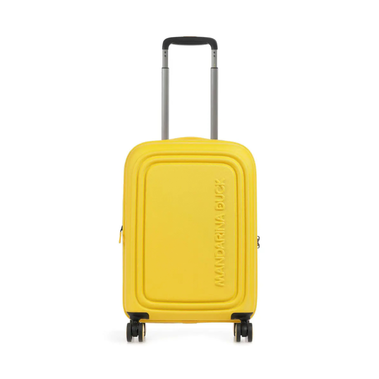 Mandarina Duck Yellow Trolley Suitcase. Yellow trolley suitcase closes with two-way zip front closure (lockable closure), one handle, two telescopic. Retractable handles, TSA combination lock and expandable size.