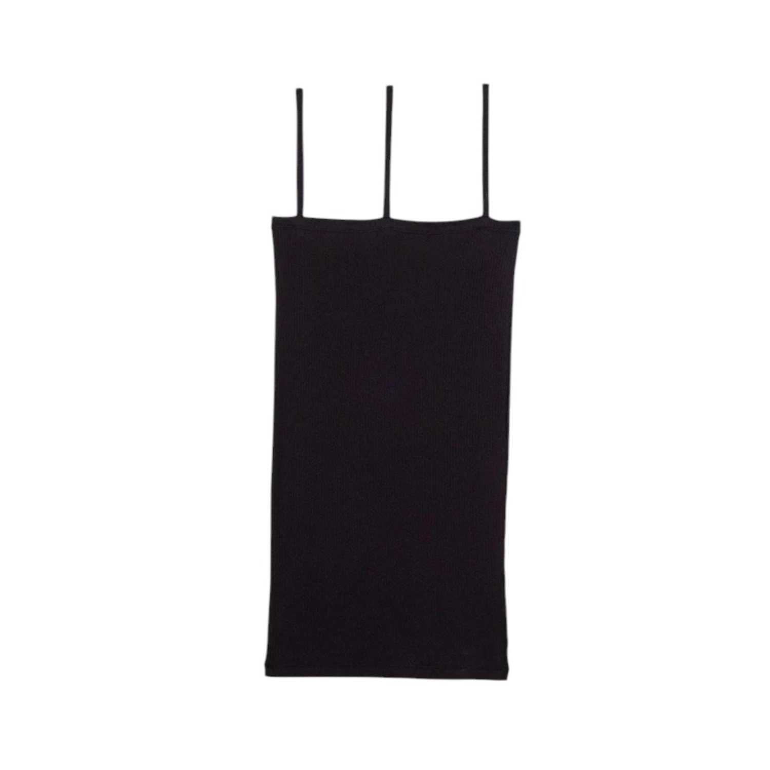 Baserange Black Nida Tank Top. Black fine cotton rib tank with thin shoulder straps and third asymmetrical strap.