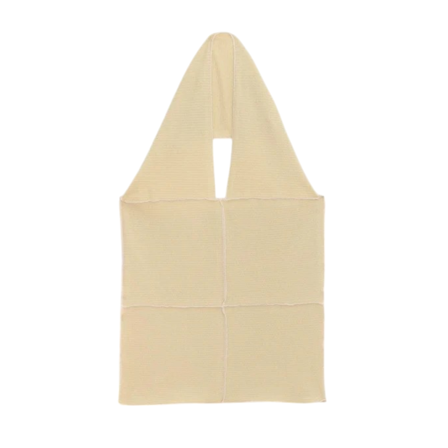 Baserange Light Yellow Cinder Halter Top. Light yellow organic cotton rib top, halter neck. Exposed seams, lettuce edge at hem.