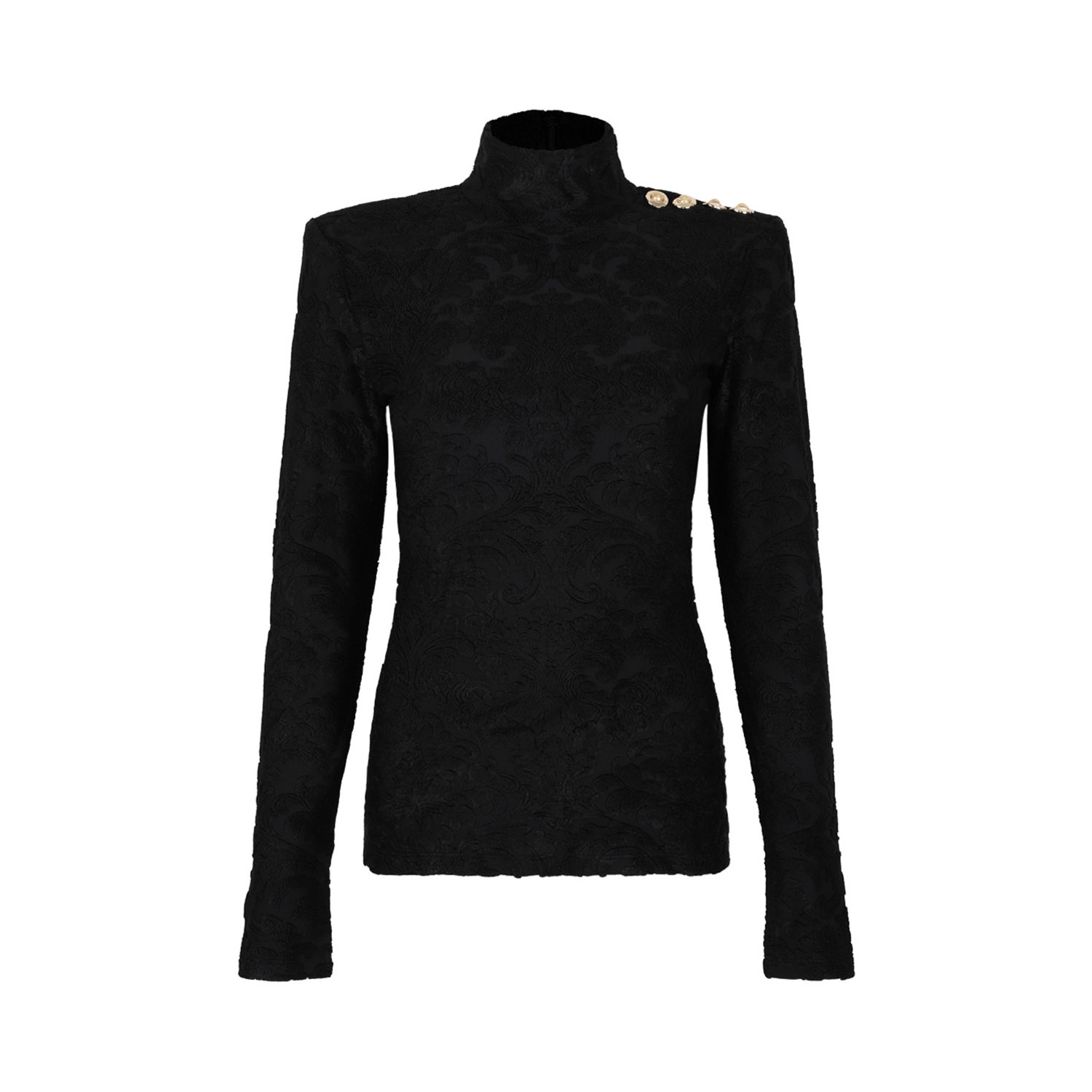 Balmain Black Boucle Baroque Pattern Top. Black boucle baroque pattern long-sleeved top with high neck, 4 decorative "Gold and Gold Coin" buttons in metal on the shoulder. Structured shoulders, invisible back zip fastening.