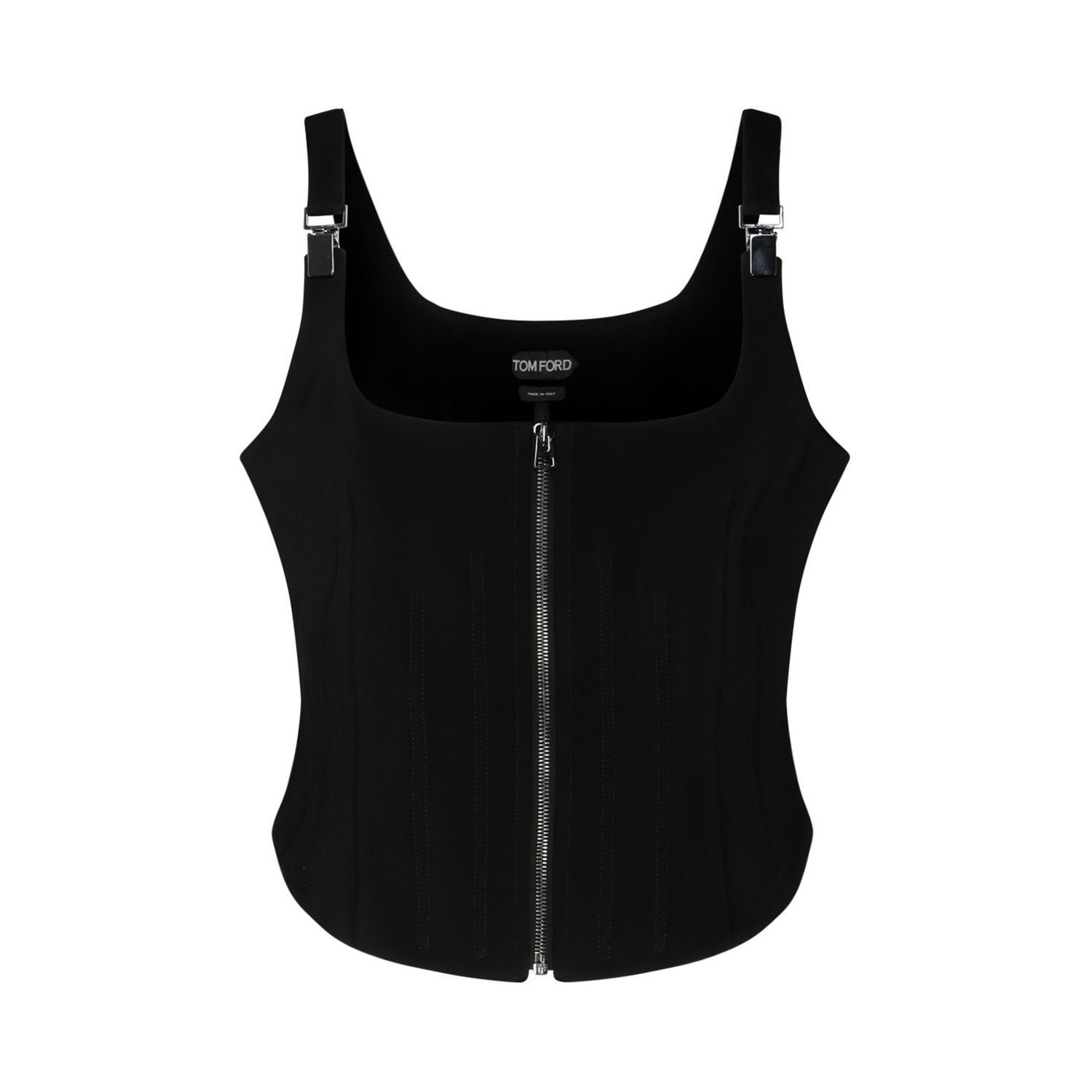 Tom Ford Black Stretch Silk Corset Top. Black silk top, corset style, square neck, adjustable shoulder straps, front zip fastening, boned bodice, silver tone hardware.