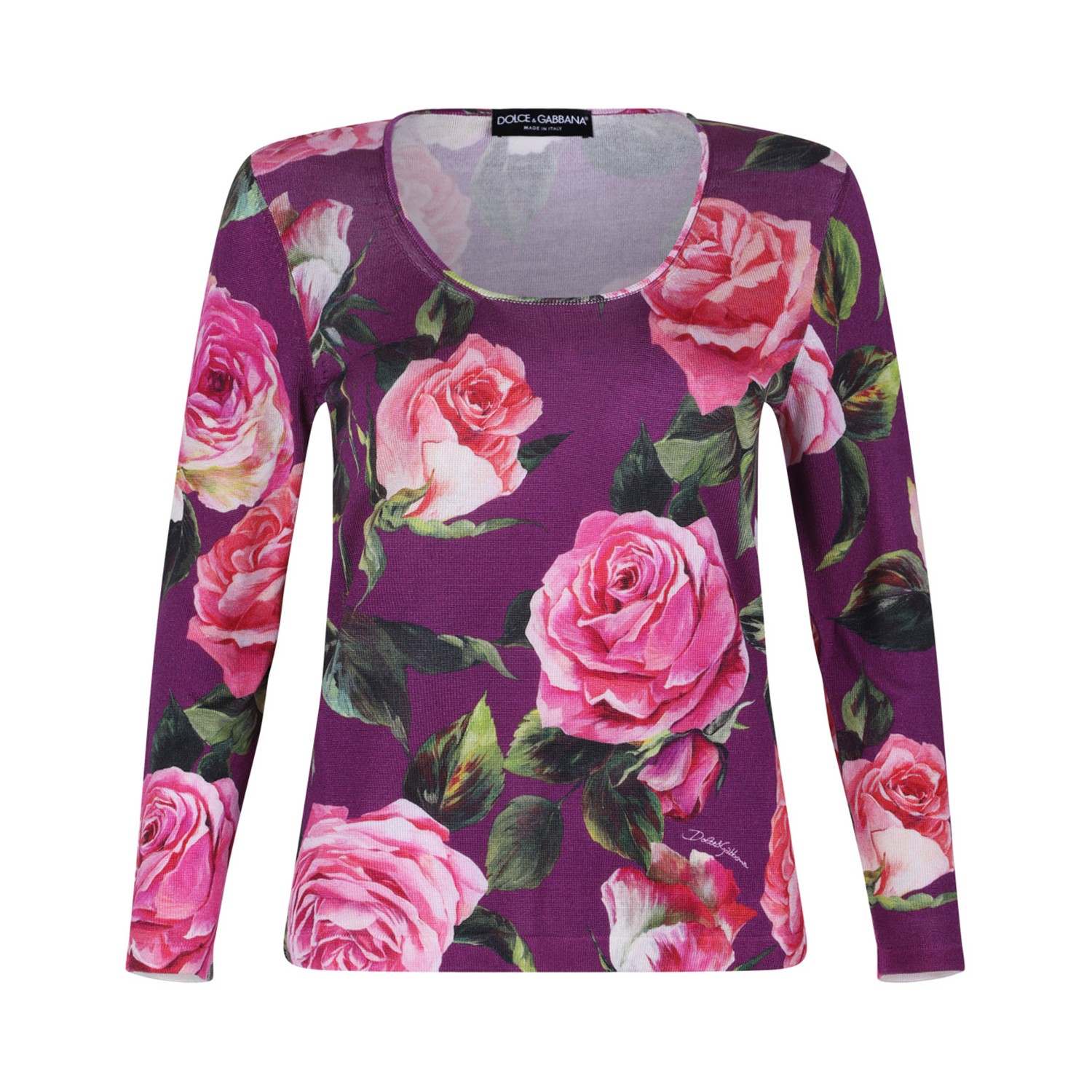 Dolce & Gabbana Floral Print Top. Purple floral print top, scoop neck, long sleeves, straight hem.