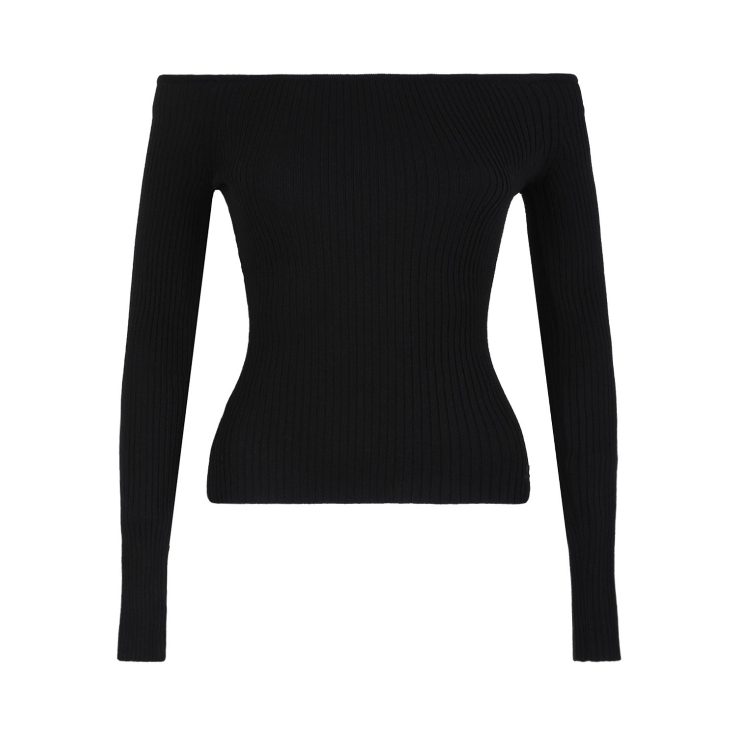 Courreges Black Off-Shoulder Rib Knit Top. Black off-shoulder boatneck rib-knit top. With long sleeves and embroidered AC logo on bottom.