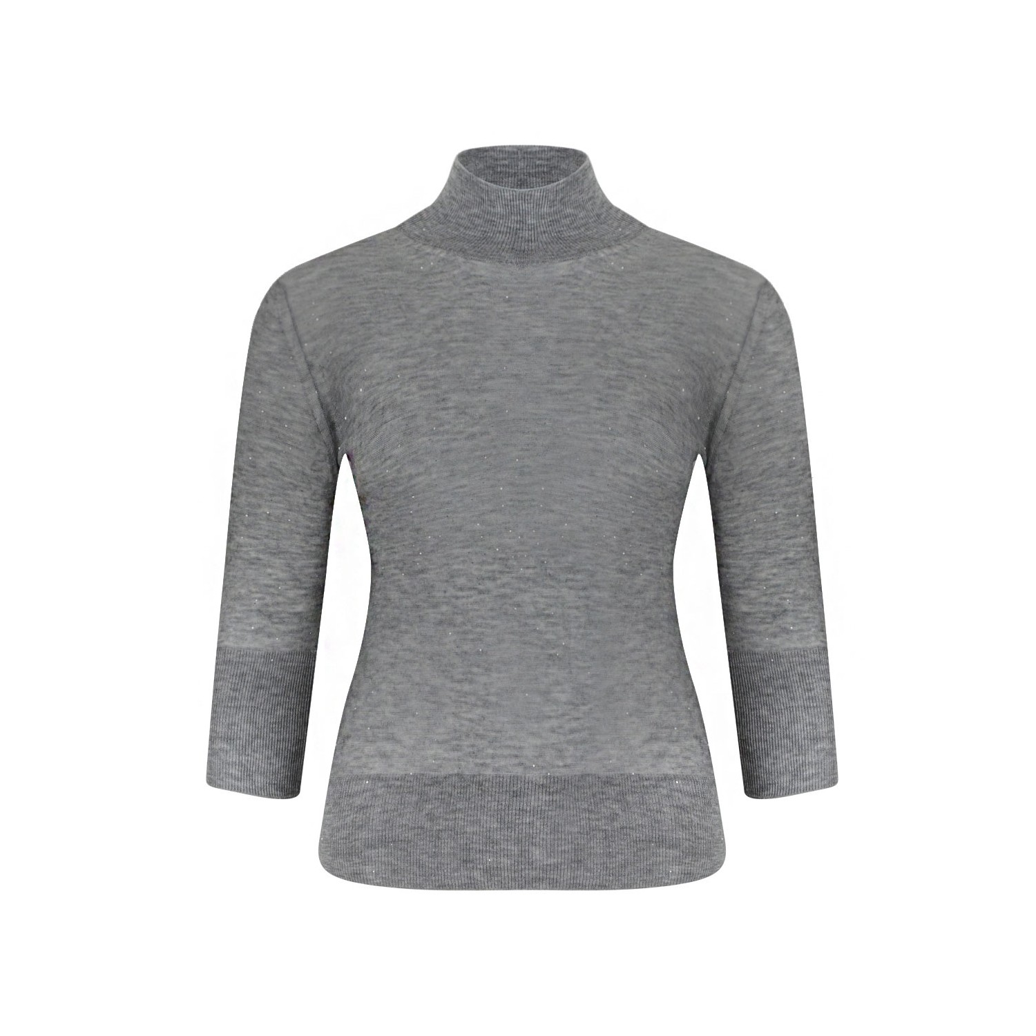 Genny Light Grey Sequin Embellished Top. Light grey sequin embellished top with mock neck and three-quarter sleeves.