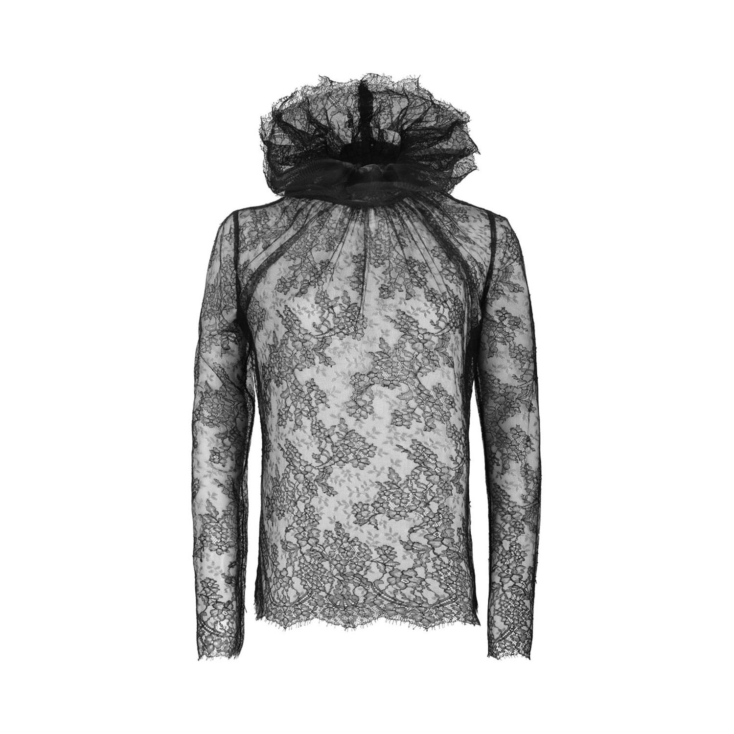 Alexander McQueen Black Floral Lace Top. Black floral lace top with a high neck and long sleeves. Hook-and-eye back closure.