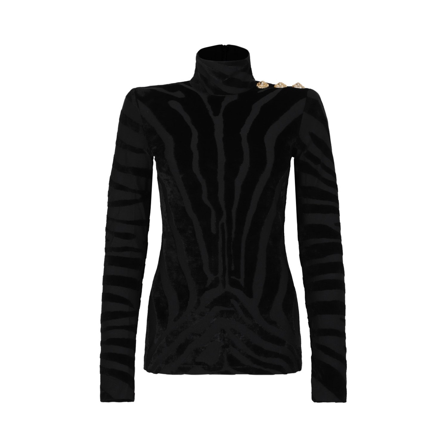 Balmain Black Printed Button Top. Black printed button top with high neck, long sleeves and button embellishment.