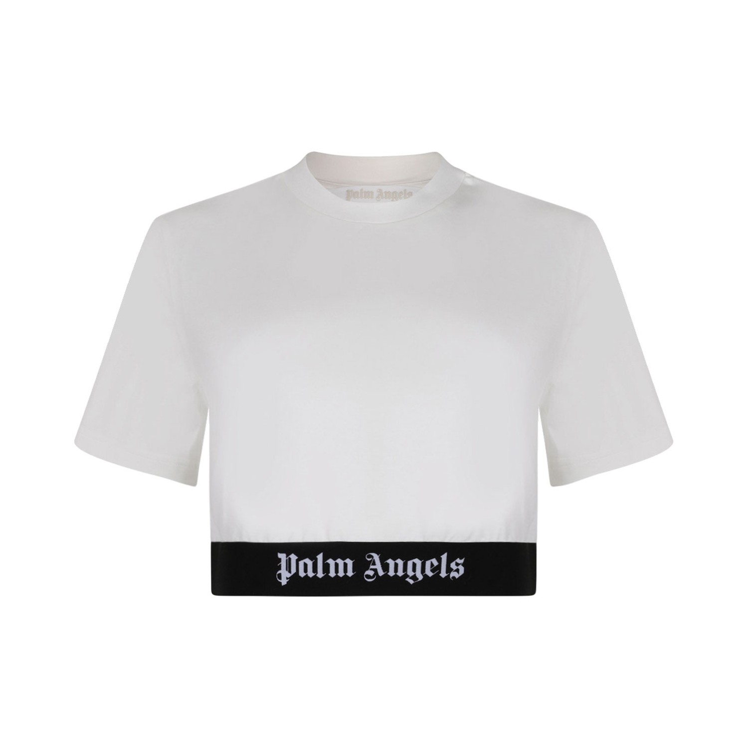 Palm Angels White Logo Underband Crop Top. White cotton crop top, jersey texture, logo underband, crew neck. Short sleeves, straight hem.