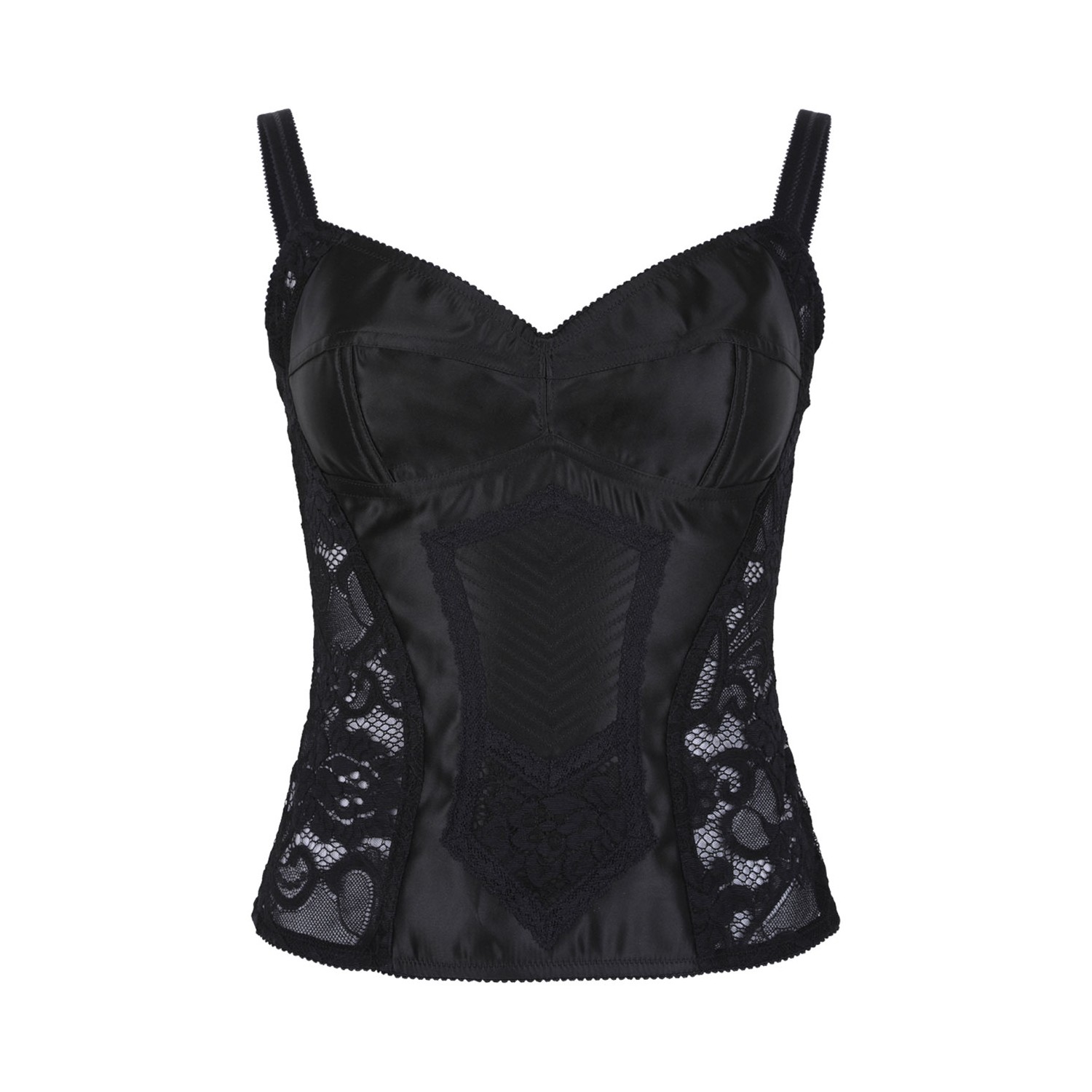 Dolce & Gabbana Black Corset Lace and Satin Top. Black corset lace and satin top with sweetheart neckline, sleeveless with adjustable shoulder straps. Lace back, lined and hook-and-eye fastenings on the back.