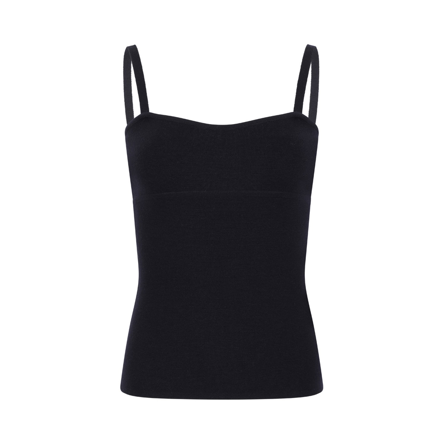 Max Mara Navy Blue Wool Yarn Top. Navy blue wool yarn top with fabric stitch work, wide sweetheart neckline, thin shoulder straps.