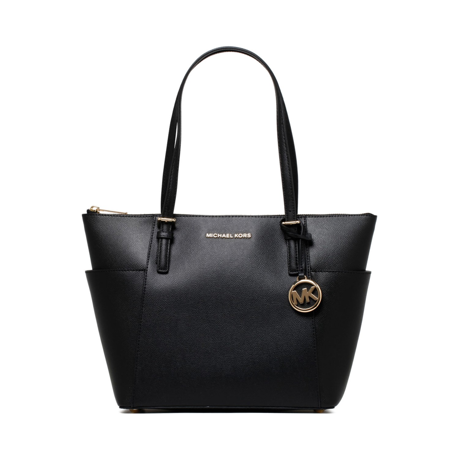 Michael Kors Black Jet Set Tote Bag. Black calf leather tote bag, gold tone details, long handles, gold tone logo plaque. Side pockets, logo charm, top zip closure, internal zip pocket, internal bellows pockets, full lining and metal foot.