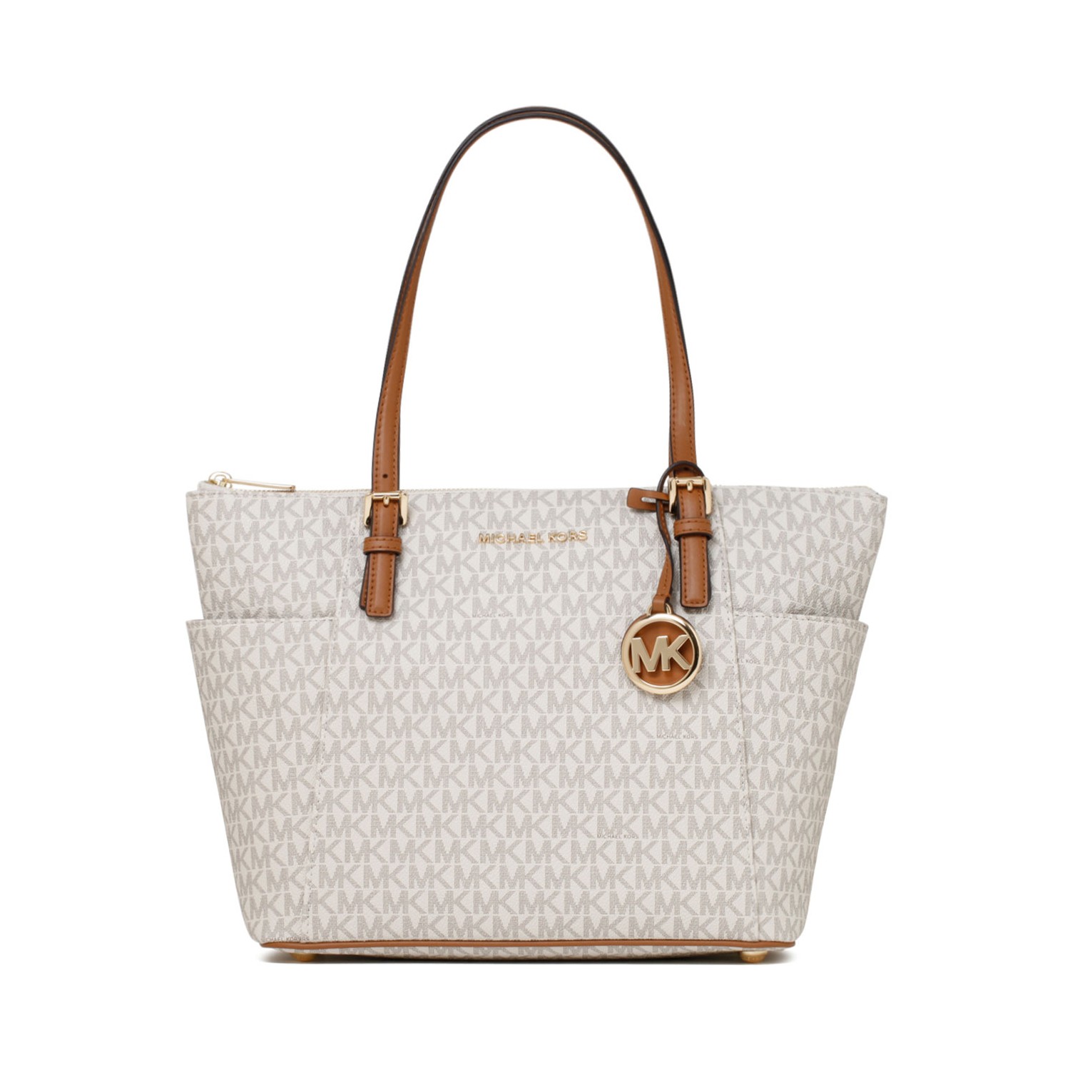 Michael Kors Vanilla Jet Set Tote Bag. Vanilla calf leather tote bag, all over logo print, gold tone details, long handles, gold tone logo plaque. Side pockets, logo charm, top zip closure, internal zip pocket, internal bellows pockets, full lining and metal foot.
