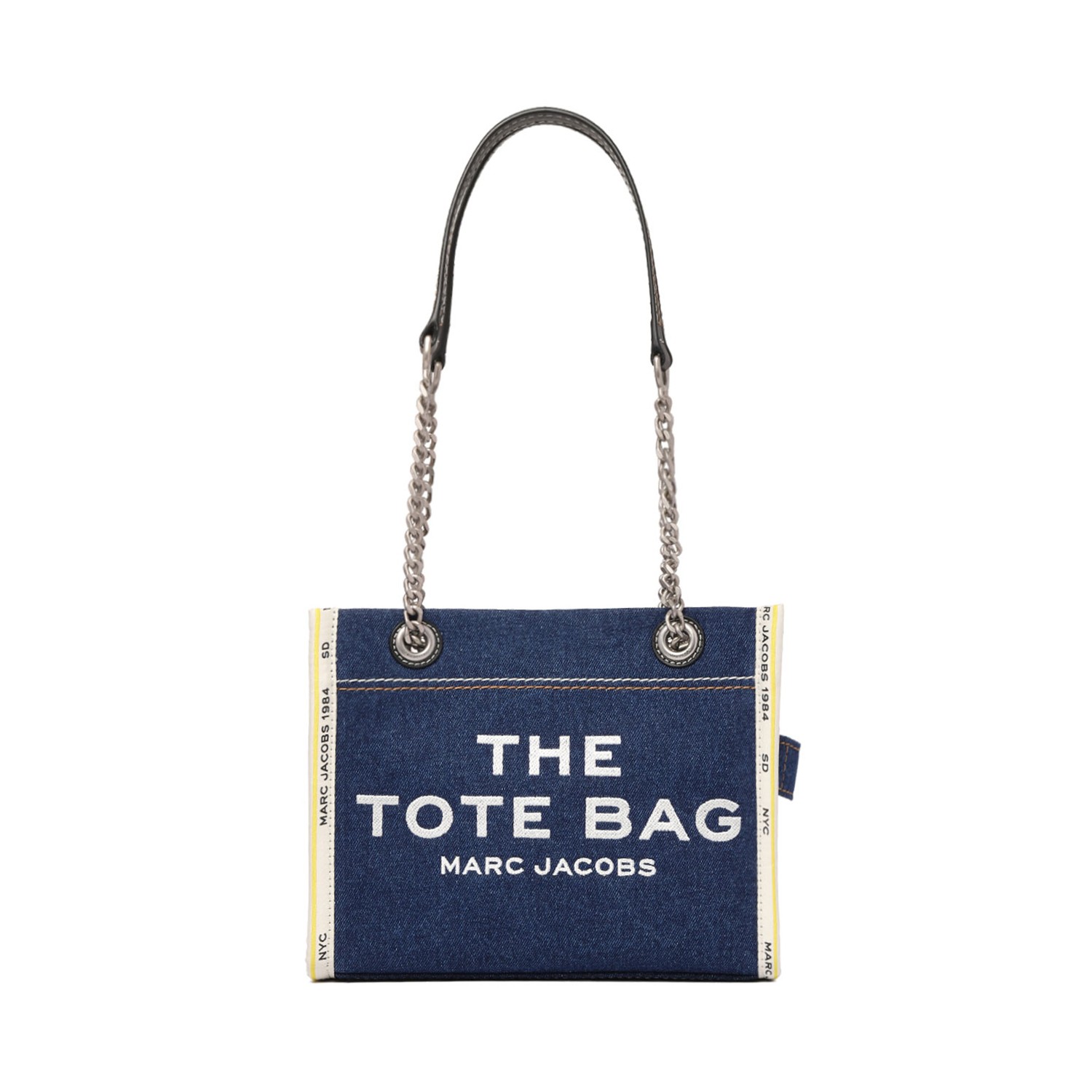 Marc Jacobs Indigo Blue The Denim Chain Small Tote Bag. Indigo blue cotton small tote bag, washed denim, embroidered logo to the front, logo-print edge. Applique logo, two chain-link top handles, top zip fastening, main compartment, internal zip-fastening pocket.