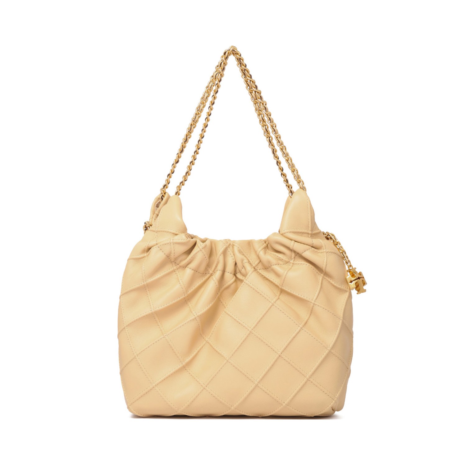 Tory Burch Vanilla Fleming Tote Bag. Vanilla nappa fleming tote bag. Tassel, drawstring closure, chain shoulder strap, silver logo plate, single compartment.