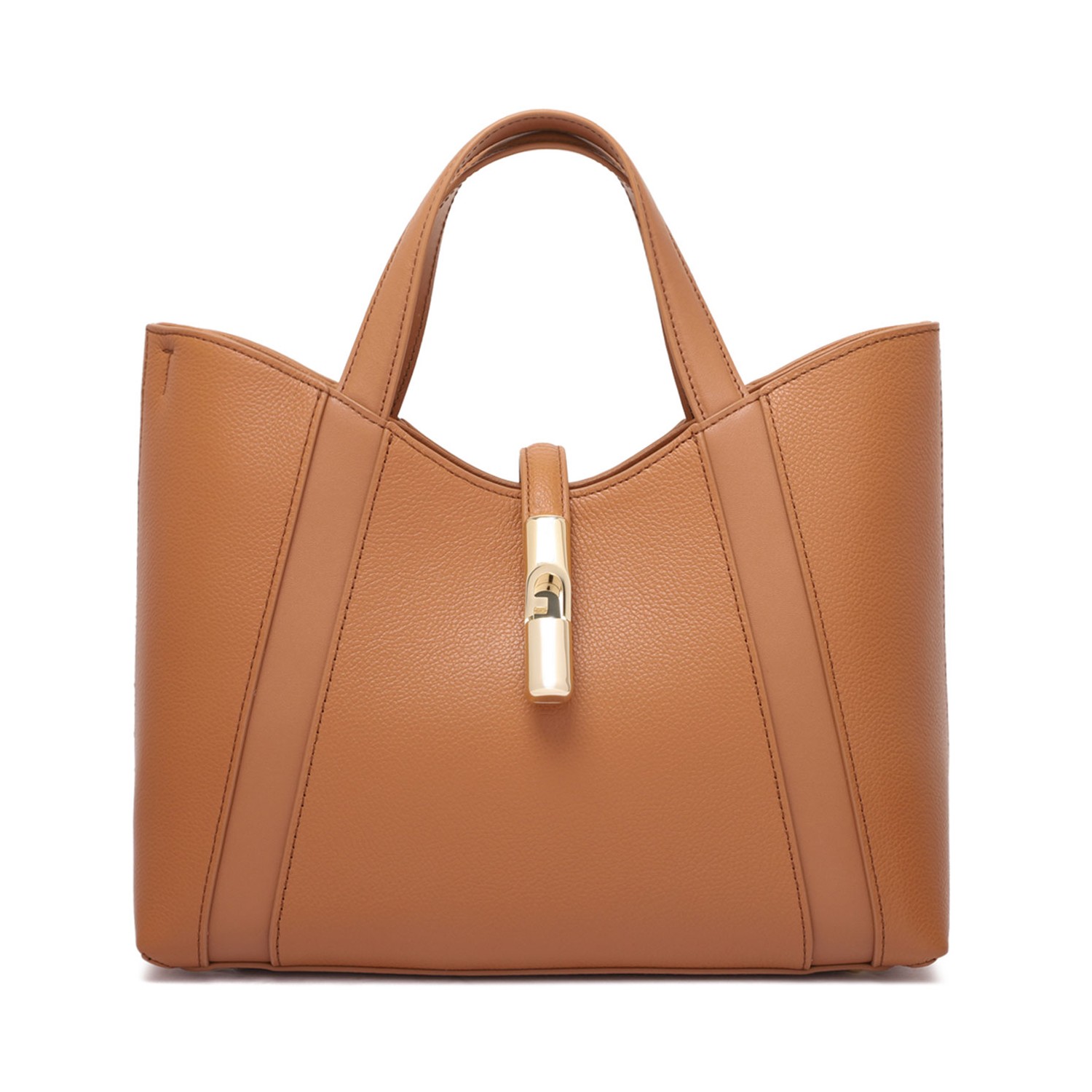 Furla Brandy Goccia S Tote Bag. Brandy white fine grained leather tote bag with soft and deconstructed silhouette, internal wall pocket with zip closure. One internal open wall pocket, metal feet, adjustable and removable shoulder strap.