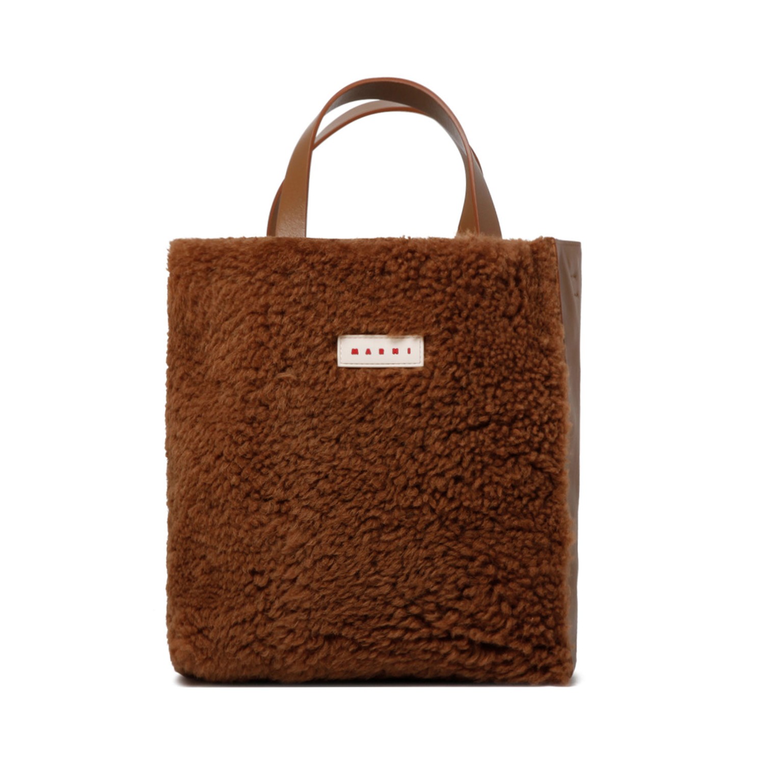 Marni Tobacco Brown Shearling Logo Patch Tote Bag. Tobacco brown lambskin/cotton/shearling tote bag, logo patch to the front, two flat top handles, open top, detachable shoulder strap, main compartment and internal zip fastening pocket.