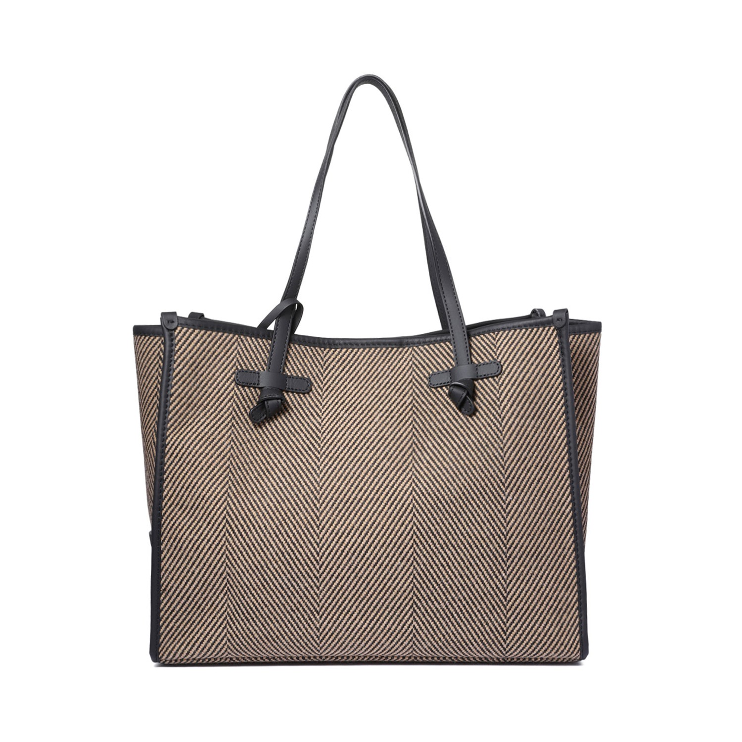 Marcella Spiga Tote Bag. The Marcella tote bag by Gianni Chiarini Firenze, with its simple yet refined silhouette, is crafted from herringbone wool. Featuring leather handles and a convenient magnetic closure, it's ideal for everyday wear. The design is enhanced by leather trim, adding a touch of elegance. The lining and pouch, matching the trim color, make it a versatile accessory for completing even the simplest of looks.