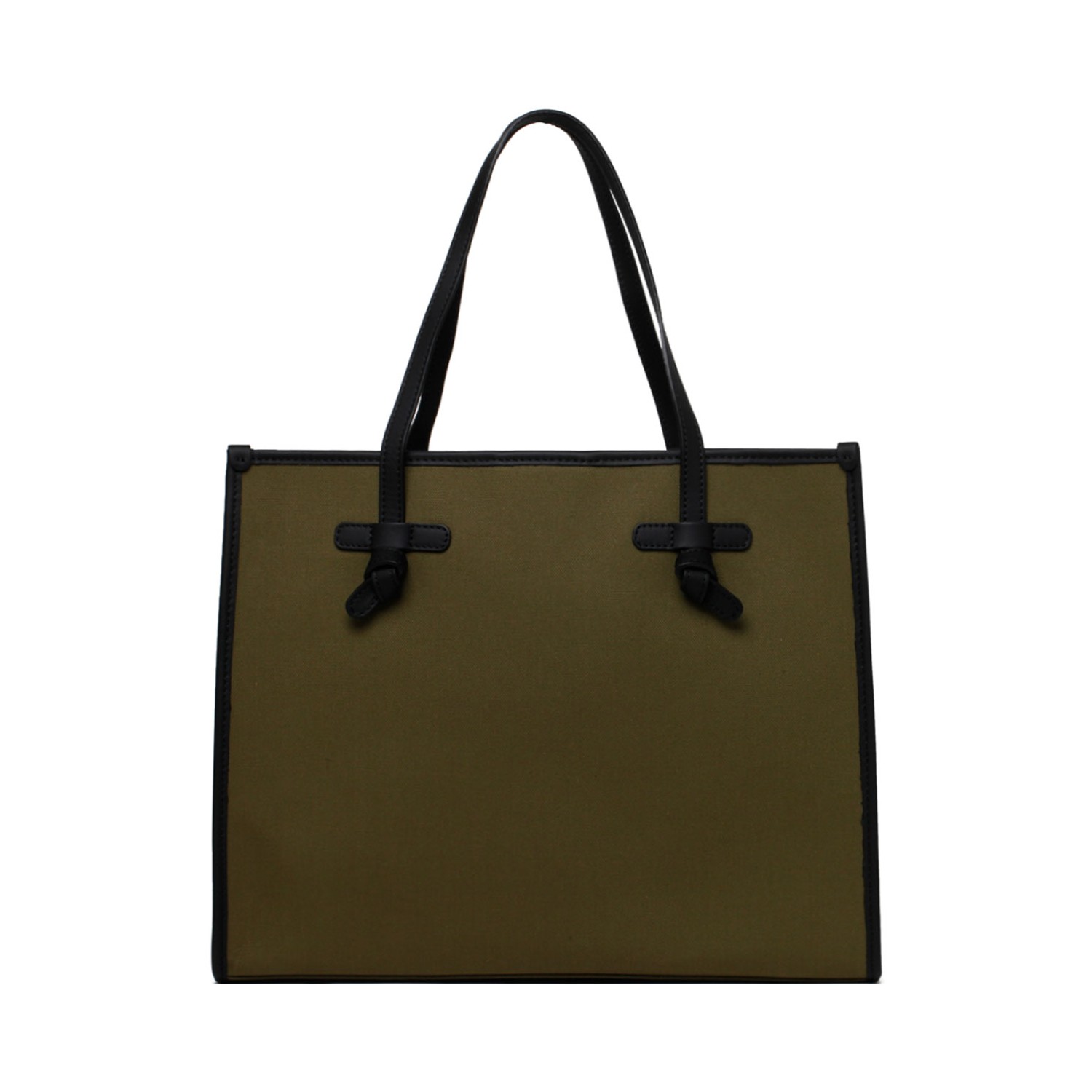 Marcella Military - Rope Shopping Bag. Military - rope shopping bag made of two-tone canvas. A timeless style icon thanks to its minimal design, enriched by leather profiles. Equipped with leather handles and a convenient magnetic closure, it is ideal for daily use. The contrasting internal lining and the leather clutch bag in the same color as the finishes make it one of a kind.