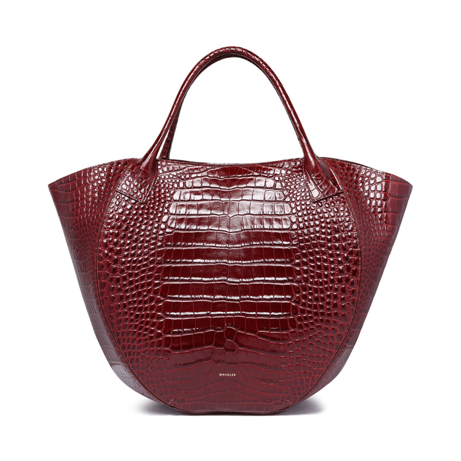 Wandler Bordeaux Croco Hortensia Shopper Bag. Bordeaux croco shopper bag with zip closure, main compartment, inside pocket. Backside zip pocket, detachable shoulder strap. Can be worn as a handbag or shoulder bag.