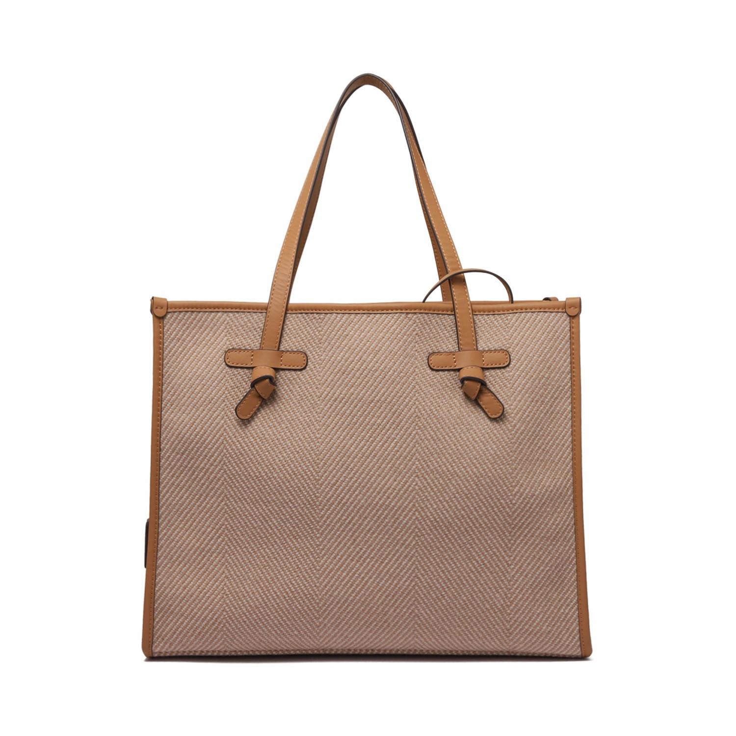 Marcella Almond Spiga Tote Bag. The Marcella tote bag by Gianni Chiarini Firenze, with its simple yet refined silhouette, is crafted from herringbone wool. Featuring leather handles and a convenient magnetic closure, it's ideal for everyday wear. The design is enhanced by leather trim, adding a touch of elegance. The lining and pouch, matching the trim color, make it a versatile accessory for completing even the simplest of looks.