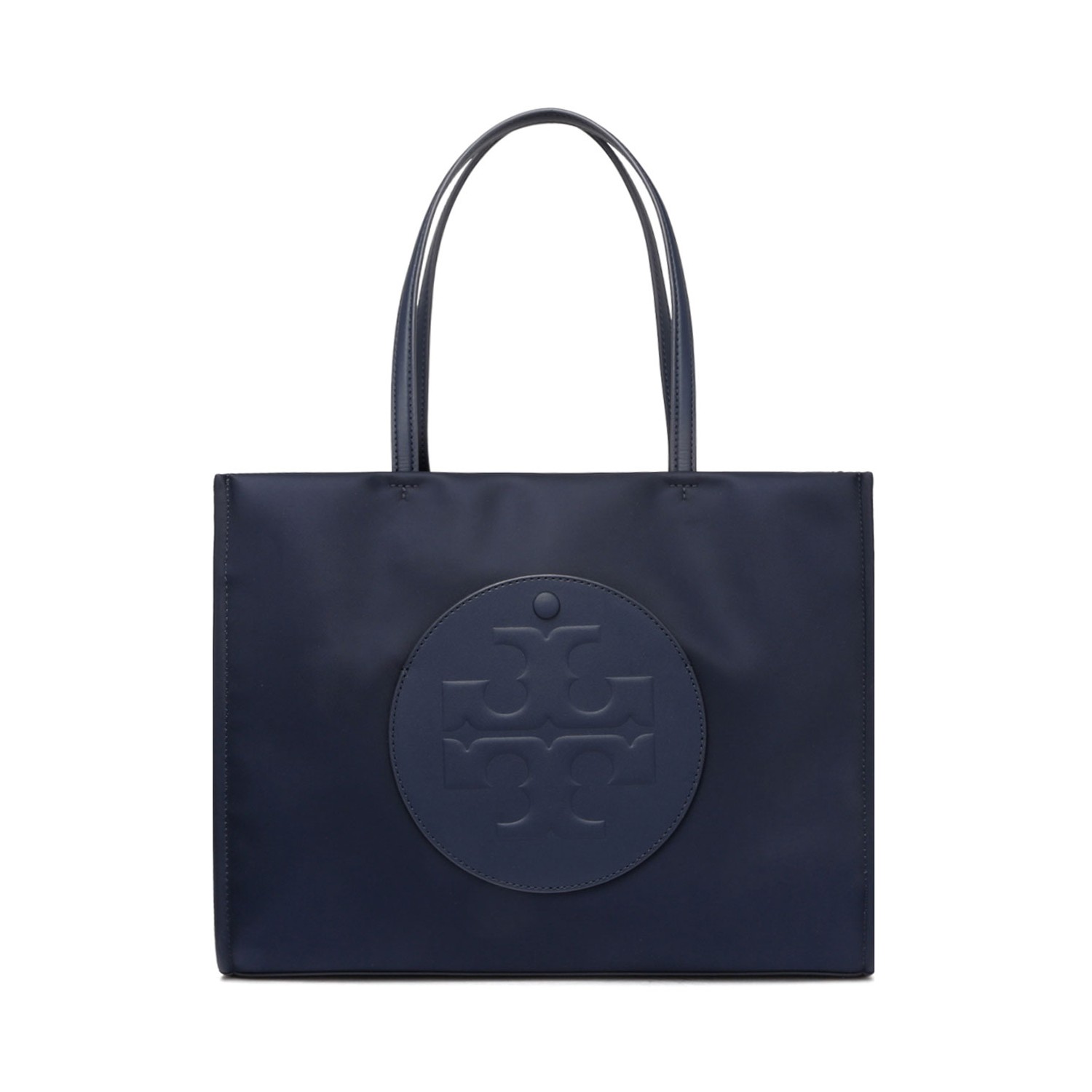 Tory Burch New Navy Small Ella Tote Bag. Navy blue small tote bag with magnetic closure tab, one external hidden pocket on the logo patch, one internal front welt pocket, one internal back zip pocket.