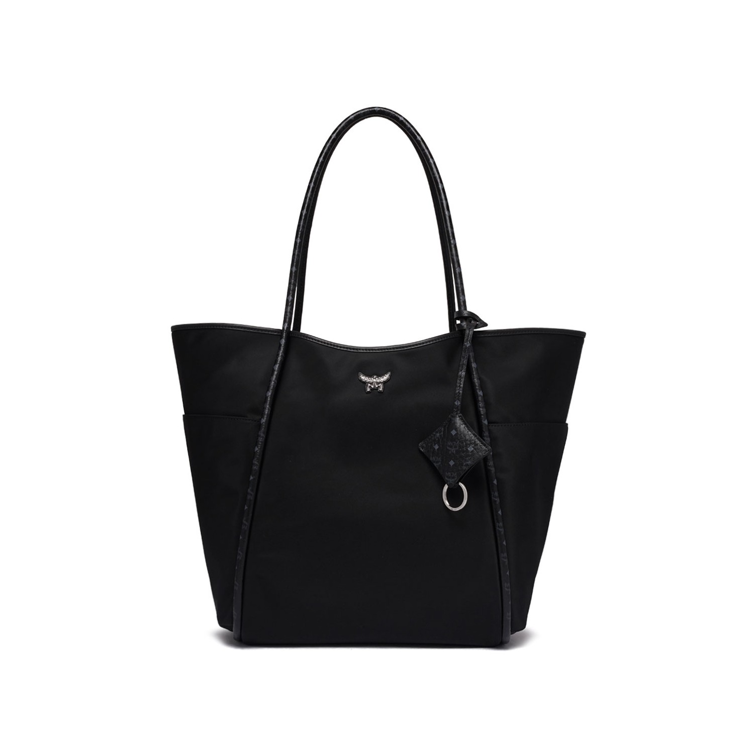 MCM Black Aren Tote Bag. Long, embellished handles and a decorative monogrammed charm give the bag a unique and prestigious look. The metal designer logo in the form of a stylized "M" and wing motif harmoniously complements the overall tonality, showcasing the recognizable aesthetic of the MCM brand, originating from Munich.