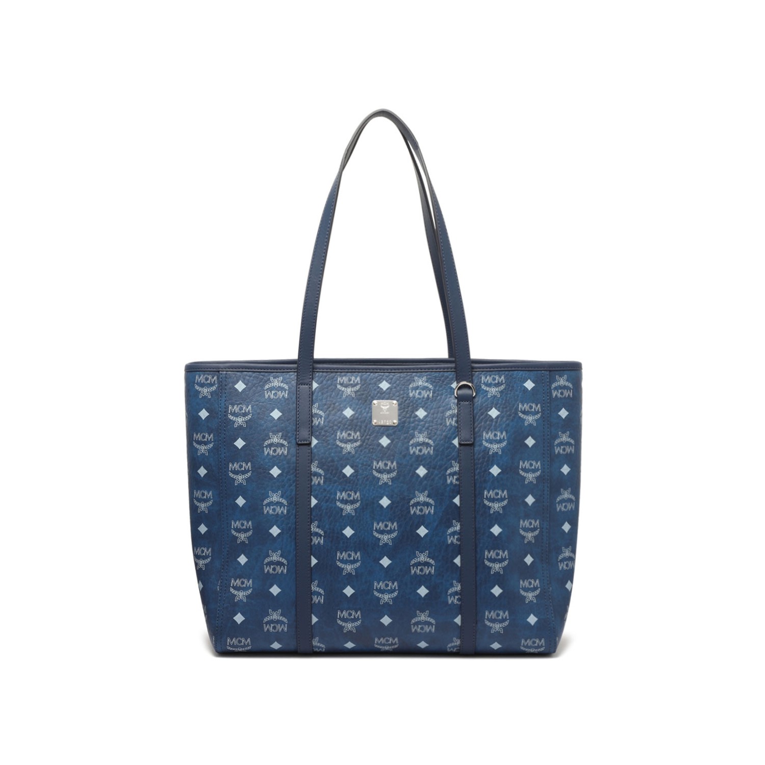 MCM Blue Toni Visetos Monogram Canvas Top-Zip Tote Bag. Blue canvas top zip fastening tote bag with Visetos monogram canvas, two top handles.