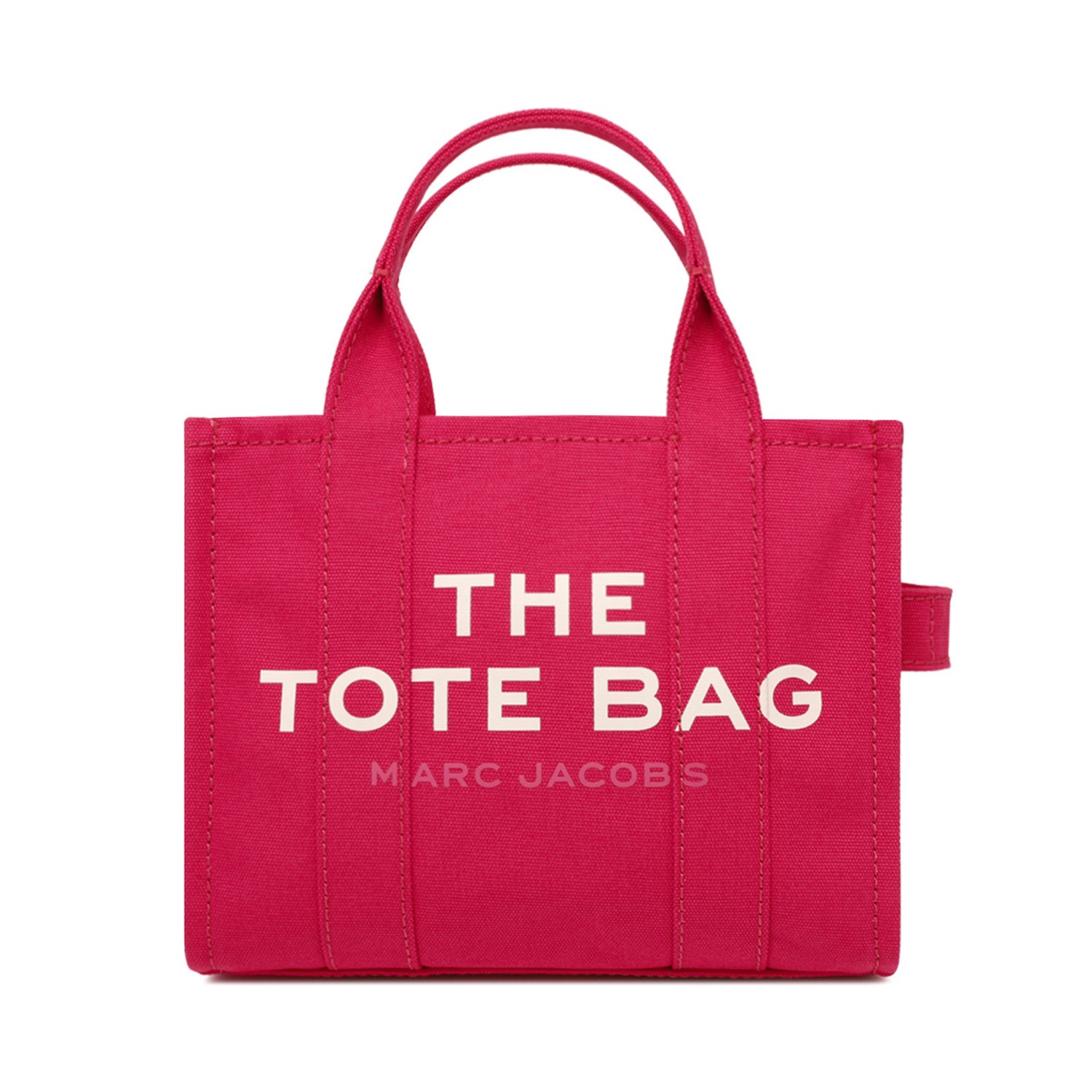 Marc Jacobs Raspberry Pink The Small Tote Bag. Rasperry pink canvas small tote bag with logo print to the front, robust top handles, sturdy top zipper, slip pocket, card slot, removable cross strap.