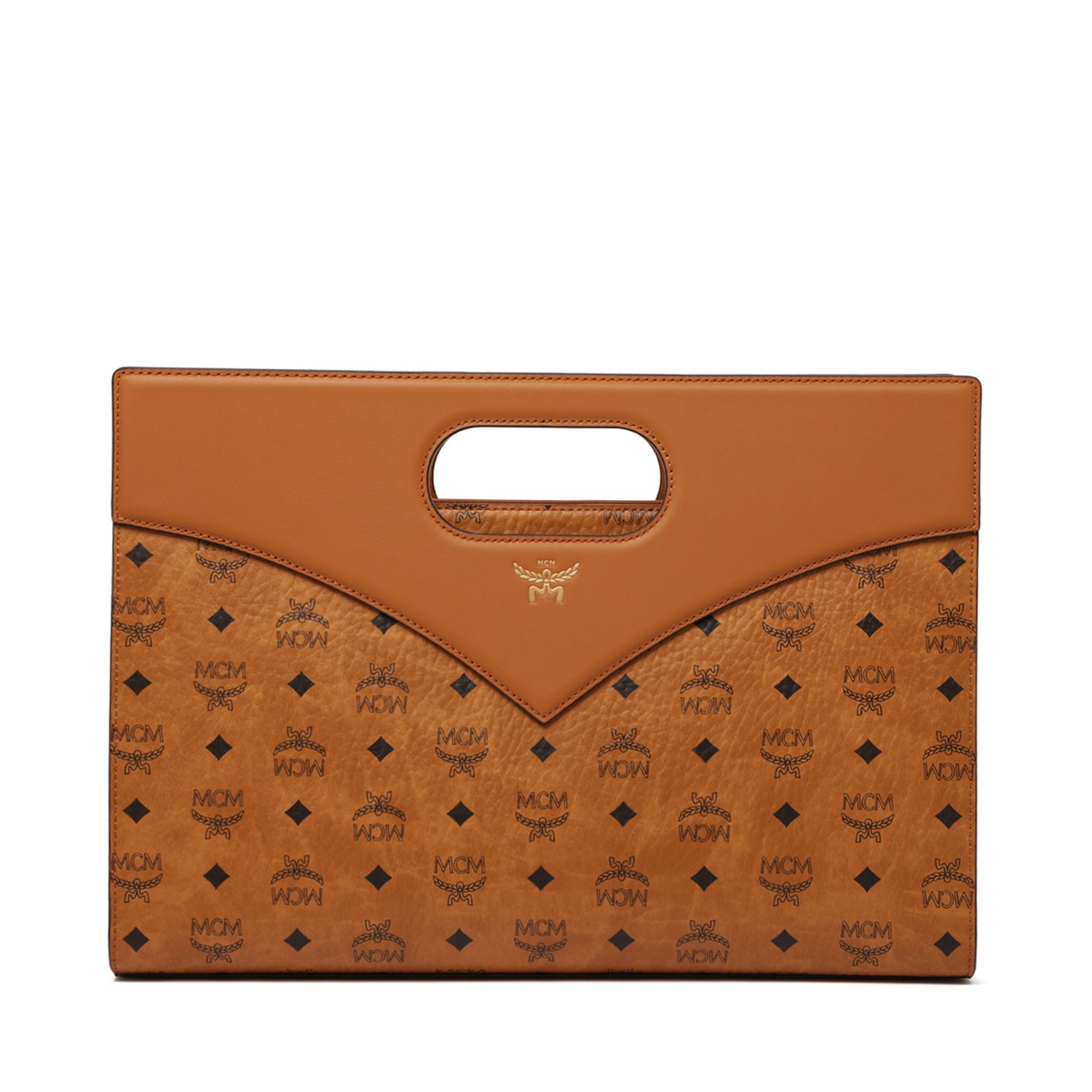 MCM Cognac Diamond Visetos Media Tote Bag. Cognac leather tote bag with hammered texture, Visetos print feature, leather finishes, cut-out handle. Adjustable and removable shoulder strap, single compartment and internal zip pocket.