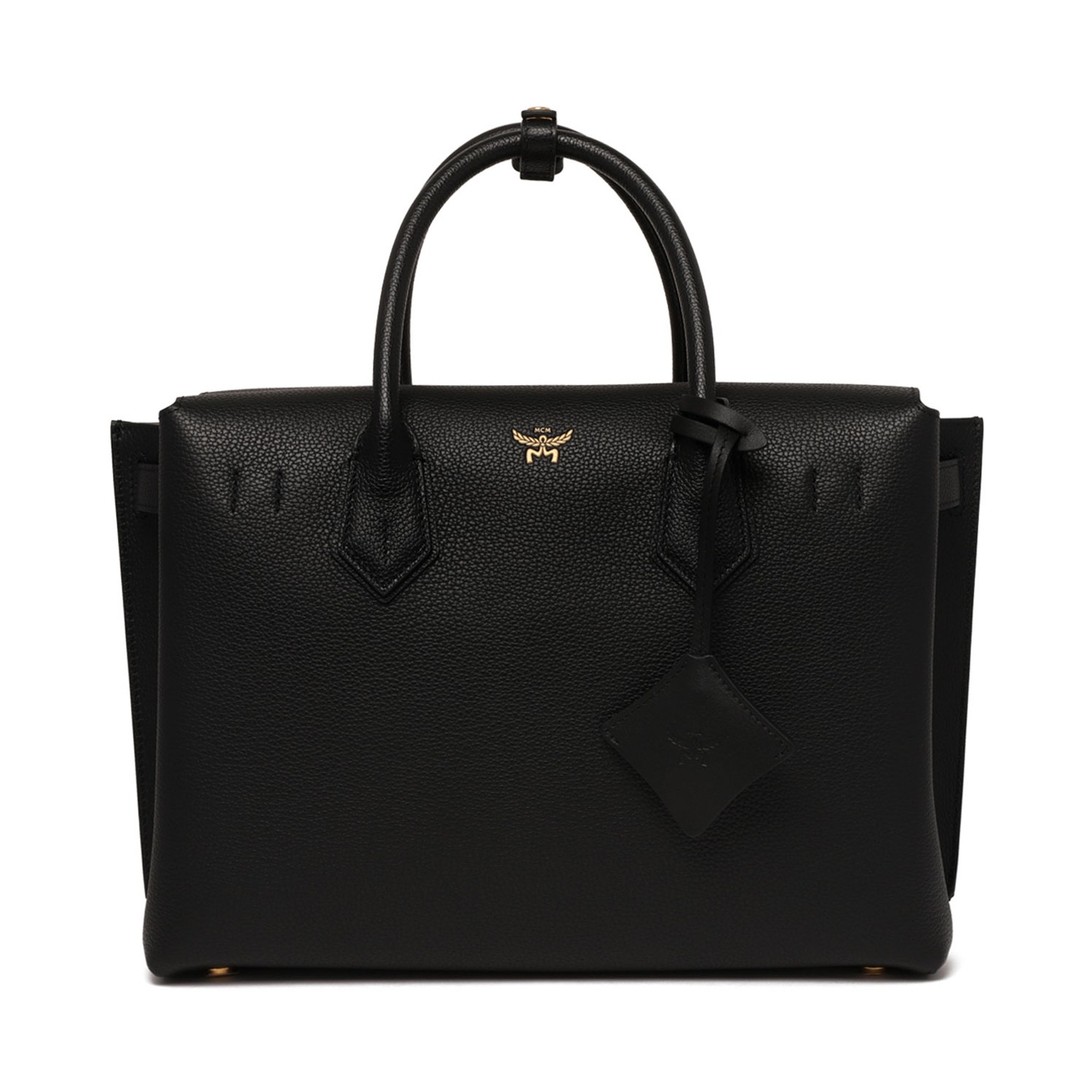 MCM Black Milla Tote With Embossed Leather. Sculpted from Spanish grained leather tote bag with detachable, adjustable leather strap. Leather top handles, detachable logo-embossed Bavarian diamond leather charm. MCM logo motif at front, magnetic tab closure, interior zip compartment.